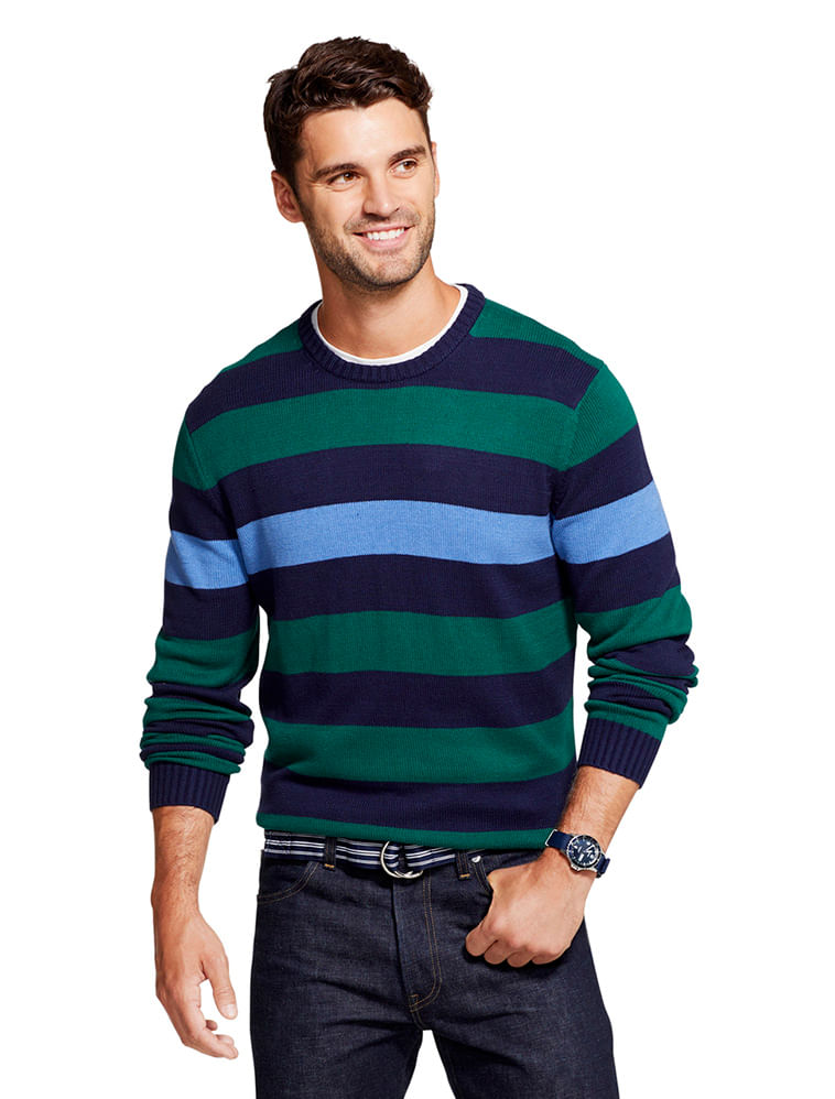 O suéter em tricot da Izod com faixas largas horizontais em marinho , verde e azul . Com decote redondo é uma opção moderna para dias mais frios e pode ser coordenada com uma calça chino, ou uma calça jeans. Em 100% algodão é fácil de lavar e secar e muito confortável.