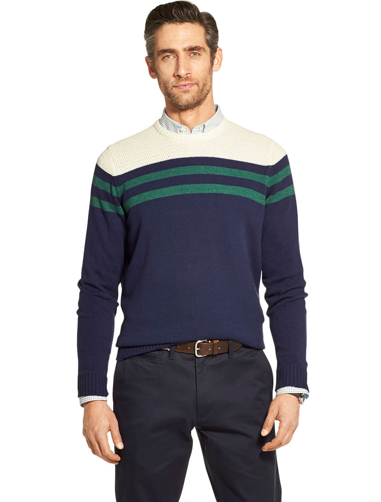 O suéter em tricot da Izod tem 2 faixas listradas horizontais no peito Em marinho , areia e detalhes em verde . Com decote redondo é uma opção moderna para dias mais frios e pode ser coordenada com uma calça chino, ou uma calça jeans. Tem algodão em sua composição , fácil de lavar e secar e muito confortável.