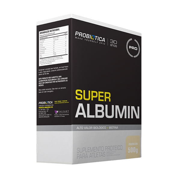 Informações técnicas do produto:<br> O Super Albumin, da Probiótica é um suplemento proteico à base de clara de ovo, que por sua vez é rica em Albumina, uma proteína de alto valor biológico! Dessa forma, fornece todos os aminoácidos essenciais que o nosso organismo não consegue produzir, destacando os BCAA’s (leucina, valina e isoleucina). Além disso, Super Albumin contém ainda maltodextrina e biotina, que conferem benefícios adicionais ao produto.<br> <br> Recomendações de consumo:<br> Bater no liquidificador ou coqueteleira 2 colheres de sopa (20g) do Super Albumin, da Probiótica, em 200 ml de água ou leite desnatado. Consumir de 1 a 2 porções ao dia, preferencialmente após os treinos.<br> <br> Sobre a marca: <br> A Probiótica, é uma empresa que ao longo dos anos veio se aperfeiçoando na produção de suplementos alimentares, e na atualidade é considerada umas das melhores marcas nacionais encontrados no mercado. A empresa utiliza as melhores matérias primas e de altíssima qualidade, para oferecer aos seus consumidores, um produto seguro e de confiança.