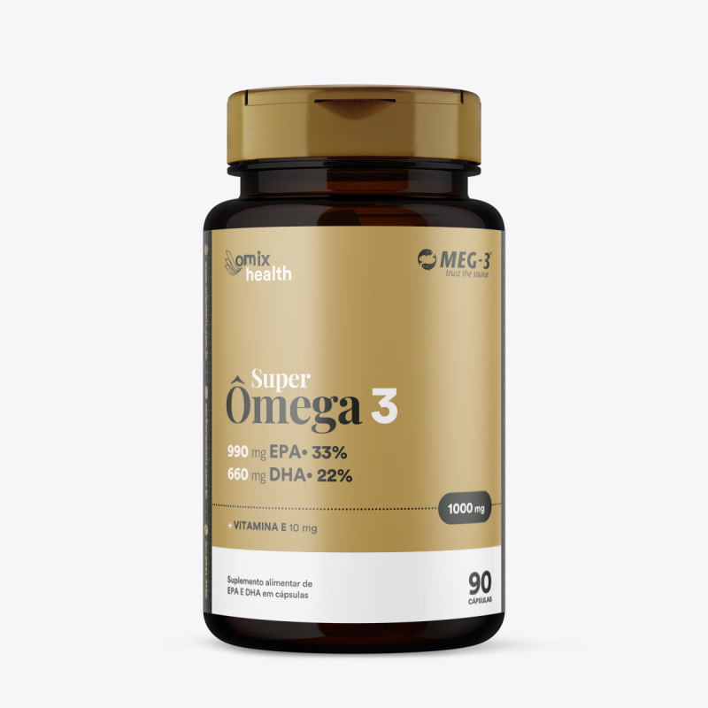 <p>O<strong> Super Ômega 3 da Omix Health</strong> é um suplemento alimentar desenvolvido com alta concentração de ômega 3, sendo 990mg de EPA e 660mg de DHA. A embalagem vem com 90 cápsulas e possui certificação MEG-3®.</p> <h2><strong>Sobre os ingredientes:</strong></h2> <p>O selo MEG-3® é um certificado que garante um ômega 3 seguro e de alta qualidade, de acordo com as diretrizes governamentais mundiais. </p> <h2><strong>Sugestão de consumo:</strong></h2> <p>Consumir 3 cápsulas ao dia, após o almoço, ou conforme orientação do médico ou nutricionista. </p> <h2><strong>Motivos para escolher o produto:</strong></h2> <ul> <li> <p>Certificação MEG-3;</p> </li> <li> <p>Sem glúten;</p> </li> <li> <p>990mg de EPA por dose;</p> </li> <li> <p>660mg de DHA por dose;</p> </li> <li> <p>Contém vitamina E;</p> </li> <li> <p>Rende 30 doses.</p> </li> </ul> <h2><strong>A Marca:</strong></h2> <p>A marca Omix nasceu no estado do Rio de Janeiro, atua produzindo e distribuindo suplementos alimentares há mais de 25 anos, com a missão em levar bem-estar, saúde e melhor performance aos seus clientes. Seus produtos são elaborados com matérias-primas de qualidade, que passam por rigoroso controle de qualidade, desde a fabricação até a chegada ao consumidor final.</p> <p> </p>