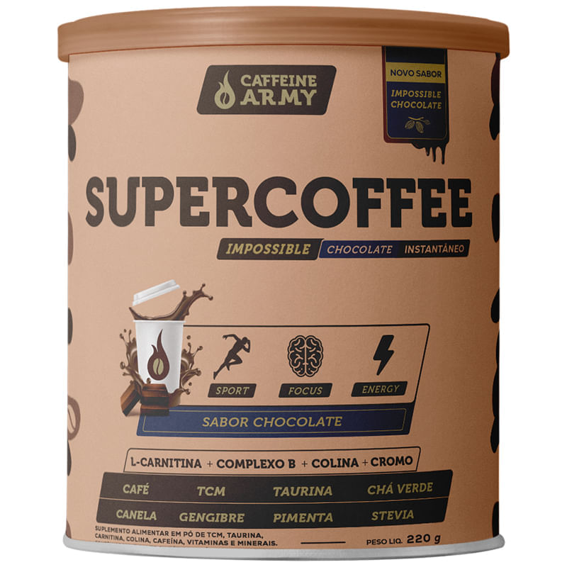 <p>O<strong> Supercoffee Impossible Chocolate Caffeíne Army 220g</strong> é uma mistura para o preparo de uma bebida energética que alia o café a 11 ingredientes naturais, incluindo TCM, taurina, carnitina, colina, cafeína, vitaminas e minerais. Sua nova fórmula equilibrada foi combinada ao cacau 100% puro e o aroma de chocolate para oferecer um sabor ainda mais delicioso. Experimente quente ou frio.</p> Sugestão de consumo: <p>Misture uma medida (scoop) de aproximadamente 10g em 100 ml de água ou conforme prescrição profissional.</p> Alergênicos: <p>Contém leite e derivados. Pode conter derivados de soja.</p> Motivos para escolher o produto: <ul> <li> <p>55 kcal na porção</p> </li> <li> <p>Sem glúten</p> </li> <li> <p>Pode ser consumido quente ou frio</p> </li> <li> <p>Sem adição de açúcar</p> </li> <li> <p>Low carb</p> </li> <li> <p>Livre de conservantes ou adoçantes artificiais</p> </li> <li> <p>Instantâneo</p> </li> </ul> Sobre a marca: <p>A Caffeine Army é uma marca voltada para a produção de fórmulas alimentícias e funcionais que podem auxiliar na melhora da performance física e cognitiva.</p>