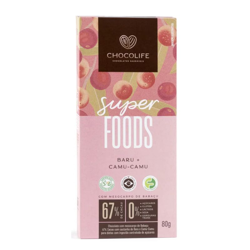 <h2 style="text-align: justify;"><strong> Superfoods Baru C/ Camu Camu 80G </strong> <strong>Chocolife</strong></h2> <h2 style="text-align: justify;">O tablete de <strong>Chocolate 67% cacau </strong>sabor <strong>Baru com Camu Camu</strong> da linha <strong>Superfoods Chocolife</strong> é uma combinação de sabores do Cerrado da Amazônia. A intensidade do cacau, combina harmoniosamente com a crocância da castanha do Baru e o toque do Camu Camu, proporcionando um chocolate encorpado e rico em nutrientes. Ele não tem adição de açúcar, não contém glúten e nem lactose e possui selo de certificação FODMAP Friendly. Você vai se surpreender com essa explosão de sabores.</h2> <h2 style="text-align: justify;"><strong>Sobre os ingredientes:</strong></h2> <h2 style="text-align: justify;">Adoçado com eritritol e stévia</h2> <h2 style="text-align: justify;"> </h2> <h2 style="text-align: justify;"><strong>Sugestão de consumo:</strong></h2> <h2 style="text-align: justify;">Uma alternativa saudável para sua sobremesa ou para aqueles momentos em que bate uma vontade de comer doce.</h2> <h2 style="text-align: justify;"><strong>Motivos para escolher o produto:</strong></h2> <ul style="text-align: justify;"> <li> <h2>Vegano e funcional;</h2> </li> <li> <h2>Certificação FODMAP Friendly;</h2> </li> <li> <h2>Fonte de fibras;</h2> </li> <li> <h2>Zero adição de açúcar;</h2> </li> <li> <h2>Sem glúten;</h2> </li> <li> <h2>Sem leite;</h2> </li> </ul> <h2 style="text-align: justify;"> </h2> <h2 style="text-align: justify;"><strong>A Marca</strong></h2> <h2 style="text-align: justify;">A Chocolife desenvolve produtos para atender pessoas que prezam por uma alimentação saudável, livre de açúcares e ingredientes alergênicos. Sendo a empresa que trouxe ao mercado o primeiro chocolate funcional no Brasil e criou o primeiro chocolate branco zero açúcar e vegano. O diferencial da marca está na produção sustentável do chocolate saudável, desde a colheita do cacau, de origem amazônica, até o processo final de fabricação, com ingredientes criteriosamente selecionados, proporcionando uma combinação perfeita entre a qualidade nutricional e o sabor, agradando a todos os paladares.</h2> <h2 style="text-align: justify;"> </h2>