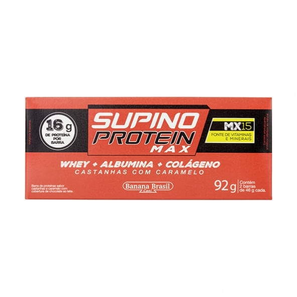 Informações técnicas do produto:<br> A Supino Protein Sabor Castanhas e Caramelo, da Banana Brasil, é uma barrinha com uma composição completa de proteínas como o whey, albumina e colágeno, além de oferecer 15% na necessidade diária de vitaminas.<br> <br> Recomendação de uso:<br> Pode ser consumido pré ou pós treino ou nos intervalos das refeições.<br> <br> Por que escolher esse produto?<br> 16g de proteína por unidade<br> Sem glúten<br> Prático<br> Contém whey, albumina e colágeno hidrolisado<br> Fornece 15% da necessidade diária de vitaminas e minerais<br> Sobre a marca:<br> A Banana Brasil, no mercado desde 1985, foi pioneira no segmento de barras de frutas e hoje conta com um vasto portfólio de produtos com ingredientes selecionados. Está sempre atenta ás tendências mundiais de comportamento e saudabilidade, garantindo sempre que os melhores produtos cheguem aos consumidores, unindo saúde e praticidade.