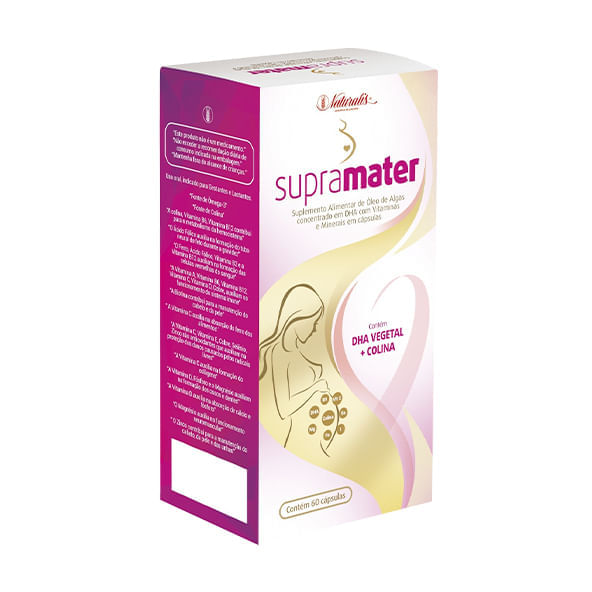 O Supramater, da Naturalis, é um suplemento alimentar composto pelos principais nutrientes essenciais durante a gestação e lactação. Sua formulação fornece 200mg de DHA, proveniente de algas marinhas (Schizochytrium SP), em cápsulas gelatinosas e pequenas para facilitar o consumo.