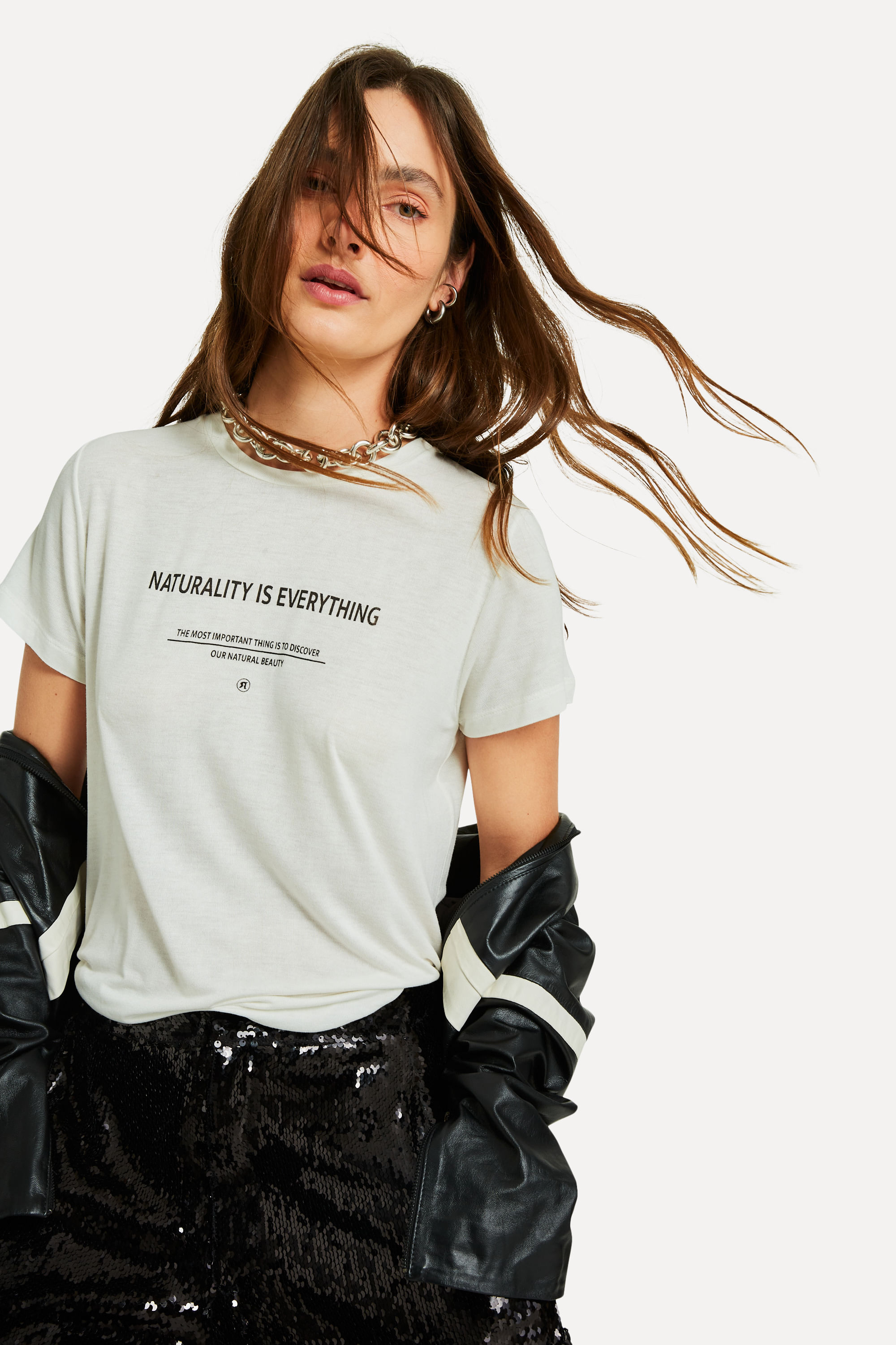 Apresentamos a T-Shirt Naturality, uma peça perfeita para o verão 24! Com uma modelagem confortável e um tecido leve e fresco, essa camiseta é ideal para os dias mais quentes. A T-Shirt Naturality é a escolha certa para quem busca conforto e estilo. A modelo tem 1,8 de altura, 83 de busto e veste 36. Use-a com shorts jeans e tênis para um visual descontraído, ou combine com uma saia midi e sandálias para uma proposta mais elegante. Comprando esta peça, você viabiliza cinco pratos de comida através do nosso Programa 1P5P.