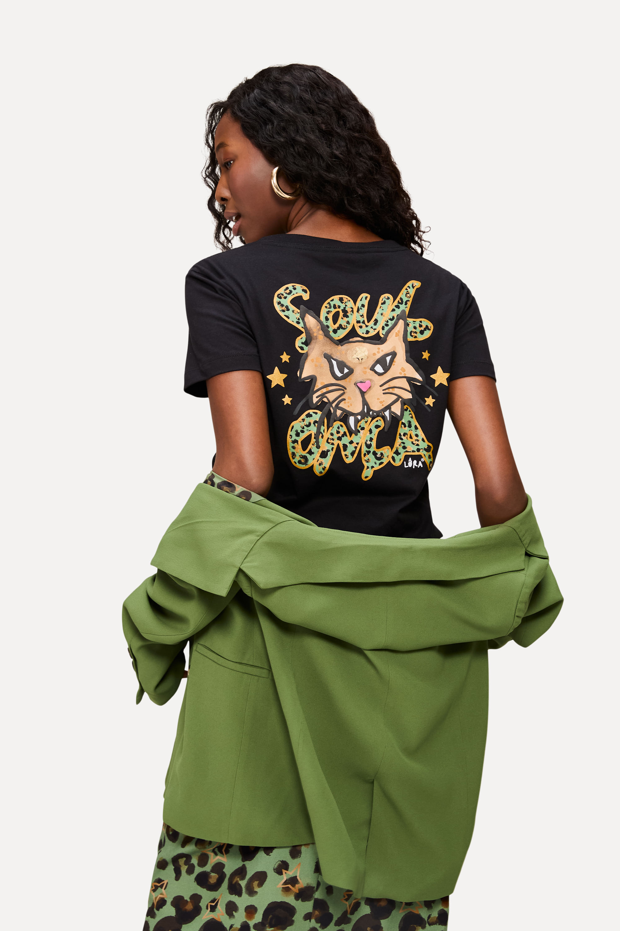 Para um dia a dia com muito mais estilo, conheça a T-Shirt Silk Soul Onça Cat, da collab Reversa + Carol Dieckmann! Feita em algodão de alta qualidade, proporciona muito conforto. Possui manga curta, gola redonda em ribana e estampa exclusiva. A modelo tem 1,76 de altura, 84 de busto e veste 36. Comprando esta peça, você viabiliza cinco pratos de comida através do nosso Programa 1P5P. T-shirt produzida eticamente no Brasil.