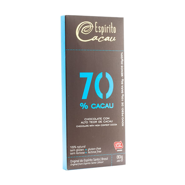 O Tablete chocolate 70% cacau, da Espírito Cacau, é um delicioso chocolate 100% natural, sem lactose, feito com apenas 3 ingredientes, sem adição de corantes, conservantes ou aromatizantes. Rico em sabor e aroma, não utiliza gordura hidrogenada, ainda é livre de glúten.