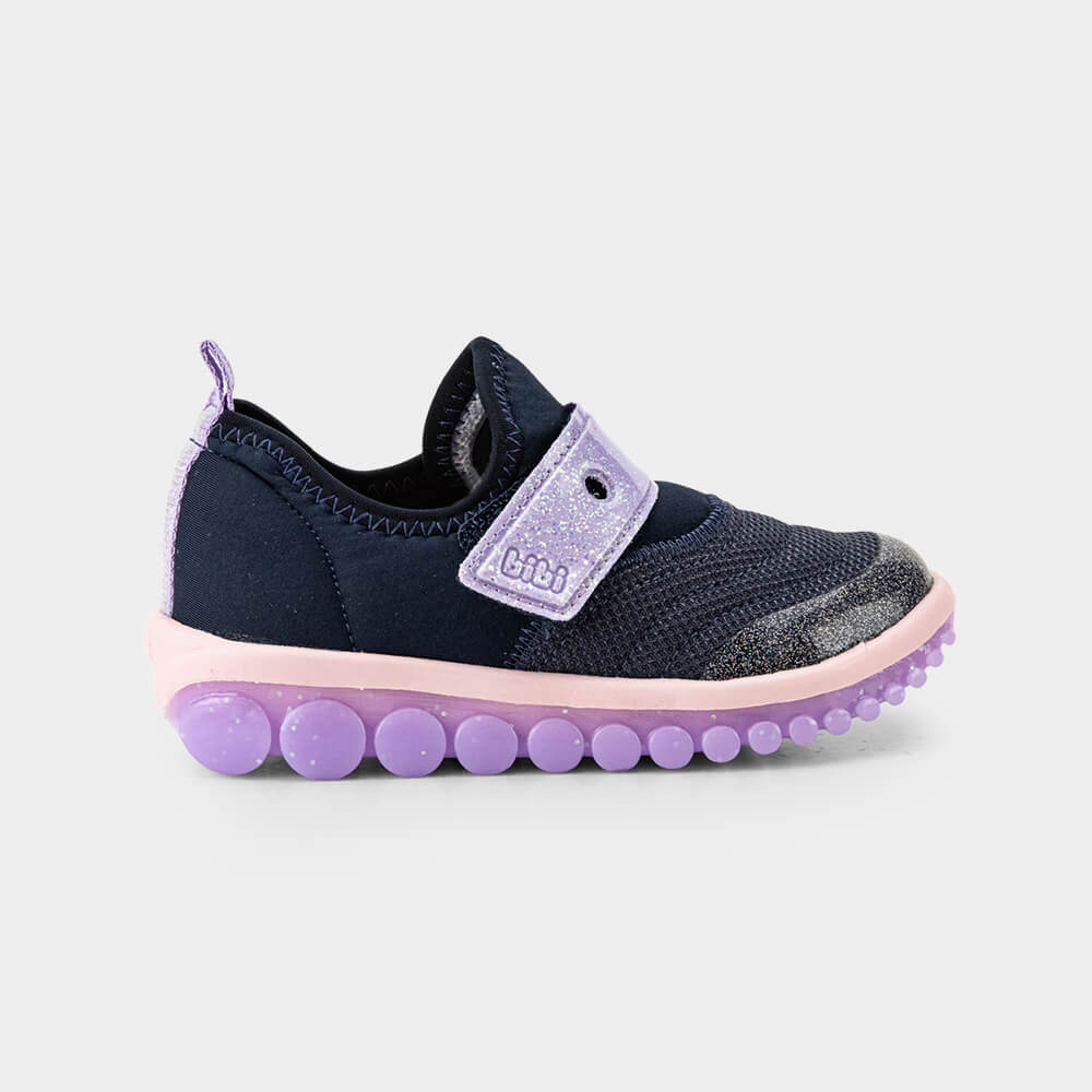 Descubra o tênis infantil feminino perfeito para as brincadeiras do dia a dia! <br> Nosso modelo na cor azul marinho com lilás apresenta um design moderno, ideal para acompanhar as crianças em todas as suas aventuras. Confeccionado em elastano, um material respirável e de fácil limpeza, o tênis oferece um ajuste excelente ao pé, garantindo conforto durante todo o uso. <br> O detalhe o fechamento em tira super divertido permite a aplicação de **Pins**, adicionando um toque personalizado ao calçado das meninas. <br> O solado inovador segue os movimentos do pé, oferecendo um design ainda mais atual e criativo. Possui a palmilha **Fisioflex,** que é macia e proporciona a sensação de andar descalço, assegurando conforto extremo para as pequenas. <br> Este tênis é a escolha ideal para pais que buscam qualidade, conforto e um visual moderno para suas pequenas.