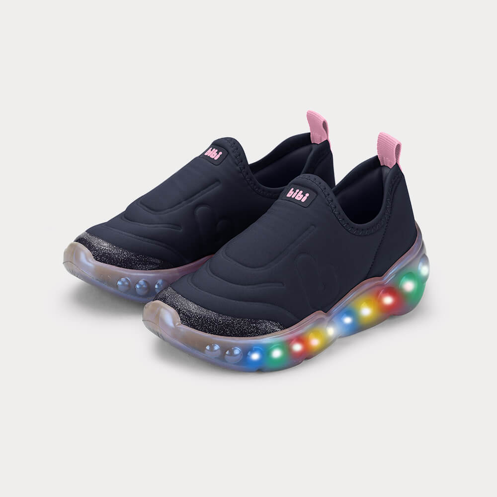 Apresentamos o lançamento do momento, o tênis infantil de luz feminino da linha Bibi Roller Celebration 3.0! <br> **Benefícios** <br> <li> Conforto: Confeccionado com materiais de alta qualidade e palmilha Fisioflex, este tênis garante conforto e durabilidade. </li> <li> Design: Na cor azul marinho com rosa, é confeccionado em elastano, fácil de calçar e se ajusta perfeitamente ao pé. </li> <li> Tecnologia: A palmilha Fisioflex promove a sensação de andar descalço e proporciona ainda mais conforto, estimulando a percepção sensorial e as terminações nervosas, o que contribui para o desenvolvimento natural e saudável das crianças. </li> **Diferencial:** <br> <li> Luzes: Possui luzes de LED que piscam a cada passo e tornam as brincadeiras mais divertidas. Com capacidade de duzentos mil ciclos, não há necessidade de carregamento. </li> Aposte neste tênis feminino para proporcionar estilo e alegria em todas as ocasiões!