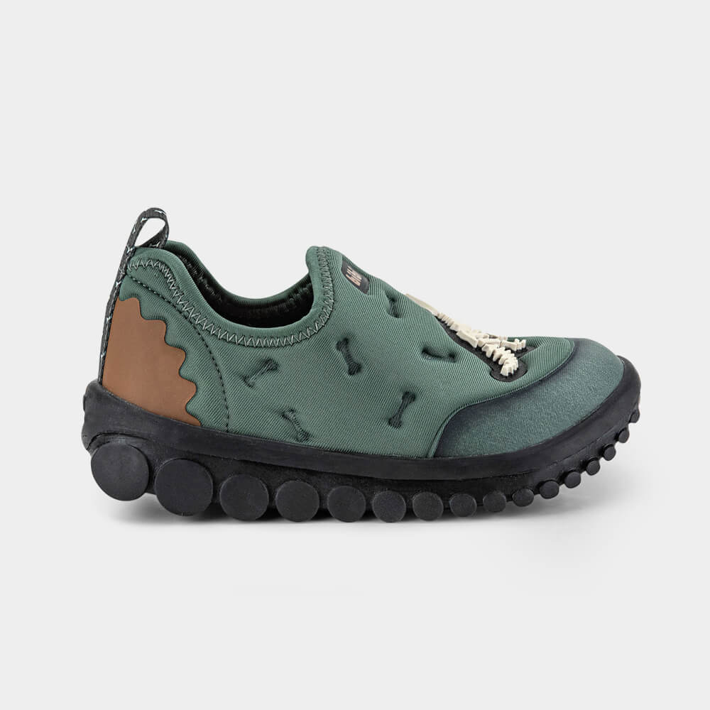 O Roller 2.0 é um tênis infantil que não possui cadarço, o deixando mais seguro para realizar as mais diversas atividades, além de ser muito fácil de calçar devido ao tecido em elastano super maleável, também proporcionando um ótimo ajuste aos pezinhos. O tênis para os meninos na cor verde folha traz o imaginário do mundo dino, com detalhe de ossinhos fósseis e de frequência, gerando mais conforto e deixando seu visual super estiloso. Entre as principais características da linha Roller está o solado com rolamentos que acompanham os movimentos do caminhar. A exclusiva tecnologia da nova palmilha Fisioflex Dry da Bibi possui espuma de alta densidade, com capacidade de absorção e amortecimento do impacto durante a caminha, também conta com pipetas que geram a sensação de andar descalço através de estímulos sensoriais nos pezinhos, auxiliando no desenvolvimento natural e saudável da criança.