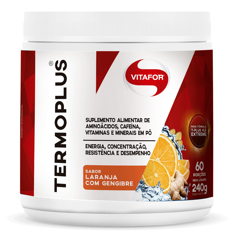 <p>O <strong>Termo Plus Laranja com Gengibre Vitafor 240g</strong>, é um suplemento formulado com aminoácidos, cafeína natural do guaraná, vitaminas (vitamina B3 e C) e minerais (cromo, selênio e zinco).</p> <p>Cada dose fornece 200mg de cafeína, uma opção que pode ser utilizada no pré-treino.</p> Sugestão de Consumo: <p>Dissolva 4g (uma colher medida/ um sachê) em aproximadamente 300mL de água ou bebida de sua preferência como sucos, shakes, iogurtes e vitaminas.</p> Motivos para escolher o produto: <ul> <li> <p>Cafeína natural do guaraná</p> </li> <li> <p>Com adição de aminoácidos (L-tirosina e L-Fenilalanina)</p> </li> <li> <p>Sem adição de açúcar</p> </li> <li> <p>Isento de alergênicos</p> </li> <li> <p>Não contém Glúten</p> </li> <li> <p>Rápida absorção</p> </li> <li> <p>Rende 60 doses</p> </li> </ul> Sobre a marca: <p>A <strong>Vitafor</strong> é uma marca nacional que está no mercado há mais de 10 anos. Tem como objetivo fabricar e desenvolver suplementos alimentares com padrão de alta qualidade e eficácia. Através de seus produtos, a <strong>Vitafor </strong>oferece confiança e eficácia nos produtos para complementar as necessidades nutricionais daqueles que se preocupam com a saúde, desempenho e bem-estar.</p>
