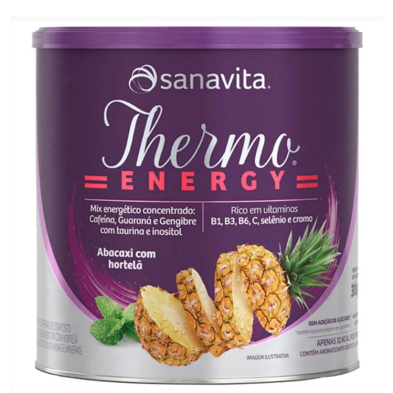 O Thermo Energy® sabor Abacaxi com Hortelã, da Sanavita, é um pó para o preparo de uma bebida energética formulada com ativos naturais do guaraná, gengibre e polpa de frutas, combinado ao mix específico de vitaminas e minerais.<br>Cada porção fornece 87,5mg de cafeína, 1g de taurina e 50mg de inositol, com o objetivo de proporcionar mais energia e disposição, mantendo o corpo ativo para enfrentar os desafios do dia a dia.<br>Sobre os ingredientes:<br>• Polpa de abacaxi: obtida pela desidratação e moagem do alimento, resultando em menor teor de água e maior concentração de alguns nutrientes.<br>• Gengibre: especiaria livre de organismos geneticamente modificados (GMO-free), confere sabor e diversos nutrientes, é uma fonte natural de gingerol.<br>• Guaraná: planta típica da região Amazônica, é uma das principais fontes de cafeína.<br>• Cafeína: encontrada naturalmente em mais de 60 plantas, auxilia no aumento do estado de alerta e na melhora da concentração.<br>• Taurina: aminoácido presente em todos os tecidos do organismo, é importante para diversos processos fisiológicos<br>Alérgicos:<br>Pode conter derivados de leite e de soja.<br>Recomendação de consumo:<br>Adicione 1 porção (10g) em 250 mL de água ou outra bebida da sua preferência e mexa até completa dissolução. <br>Sugere-se o consumo antes ou durante a atividade física ou em momentos do dia que requerem mais disposição e energia.<br>Por que escolher este produto?<br>• Rico em vitaminas B1, BB6 e C<br>• Rico em selênio e cromo<br>• Sem adição de açúcares<br>• 32 kcal na porção<br>• Sem glúten<br>• Sem lactose<br>• Livre de conservantes, corantes ou aromas artificiais<br>Sobre a marca: <br>A Sanavita é uma das principais empresas produtoras de alimentos saudáveis do Brasil, especializada no desenvolvimento de alimentos funcionais e especiais. Graças a excelente qualidade de seus produtos e à sua origem científica, conquistou a fidelidade dos profissionais de saúde e dos consumidores em todo o país.