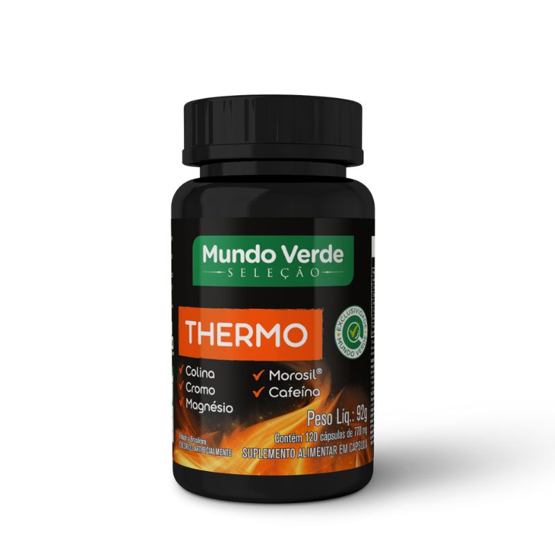 "<p>O <strong>Thermo Mundo Verde Seleção</strong> é um suplemento alimentar em cápsulas composto por extrato de guaraná, extrato de laranja moro, colina, vitamina B6, ácido fólico, magnésio e cromo.</p> <h2>Sobre o ingrediente:</h2> <p>O guaraná é fonte de cafeína, são 75mg na porção de 4 cápsulas;</p> <p>O Morosil® extrato de laranja moro fornece 450mcg de antocianinas na porção de 4 cápsulas</p> <h2>Sugestão de consumo:</h2> <p>Consuma 4 (quatro) cápsulas ao dia, sendo 2 pela manhã e 2 a tarde ou conforme orientação de médico e/ou nutricionista</p> <h2>Motivos para escolher o produto:</h2> <ul> <li>Na forma encapsulada, é de fácil consumo</li> <li>Contém colina, vitamina B6 e ácido fólico</li> <li>Contém magnésio e cromo</li> <li>Não contém Glúten</li> </ul> <h2>A marca:</h2> <p>Mundo Verde Seleção é uma marca de produtos para quem quer ter uma vida mais saudável e gostosa. A marca quer ajudar a colocar essas escolhas em prática.</p>"
