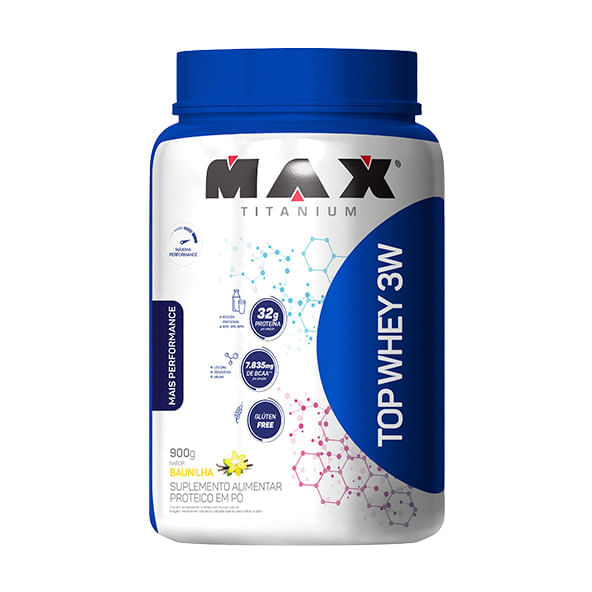 Informações técnicas sobre o produto<br> O Top Whey 3w sabor baunilha, da Max Titanium, é um suplemento proteico a base de Whey Protein concentrado e também das proteínas WPI (Whey Protein Isolado) e WPH (Whey Protein Hidrolisado). <br> <br> Informações sobre alergênicos<br> Contém derivados de leite e soja e pode conter derivados de ovo.<br> <br> Recomendações de consumo<br> Duas porções por dia ou de acordo com a orientação de nutricionista ou médico.<br> <br> Porque escolher este produto?<br> 32g de proteínas por porção;<br> 5,8g de BCAA por porção;<br> Baixo teor de carboidratos;<br> Alto teor de vitaminas e minerais;<br> Sem glúten.