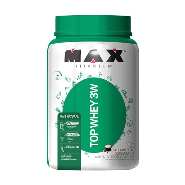 Informações técnicas do produto<br> O Top Whey 3W, da Max Titanium sabor café com leite, é um suplemento para atletas a base de proteína concentrada do soro do leite (Whey Protein), whey protein hidrolisado e whey protein isolado. Possui baixo teor de carboidratos.<br> <br> Informações sobre alergênicos<br> Contém derivados de leite e soja e pode conter derivados de ovo.<br> <br> Recomendações de consumo<br> Misture dois dosadores do produto em 150ml de água, leite ou a bebida que preferir. Ou conforme orientação profissional.<br> <br> Porque comprar este produto?<br> Fonte de vitaminas e minerais;<br> Fornece 27g de proteínas por porção (40g - 2dosadores);<br> Fornece 6,1g de BCAA por porção.