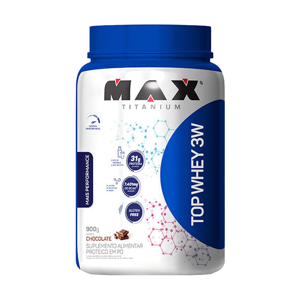 Informações técnicas do produto<br> O Top Whey 3W Chocolate 900g, da Max Titanium é uma opção de suplemento para atletas com Whey Protein concentrado, Whey Protein Isolado e Whey Protein Hidrolisado. Além de ser fonte de vitaminas e minerais, o suplemento conta com baixo teor de carboidratos.<br> <br> Informações sobre alergênicos<br> Contém derivados de leite e soja e pode conter derivados de ovo.<br> <br> Recomendações de consumo<br> Consuma uma a duas porções por dia, diluídas em água ou leite desnatado, ou conforme recomendação do nutricionista ou médico.<br> <br> Porque comprar este produto?<br> Sem glúten;<br> 31g de proteína por porção;<br> Fonte de vitaminas e minerais;<br> 5,4g de BCAA.
