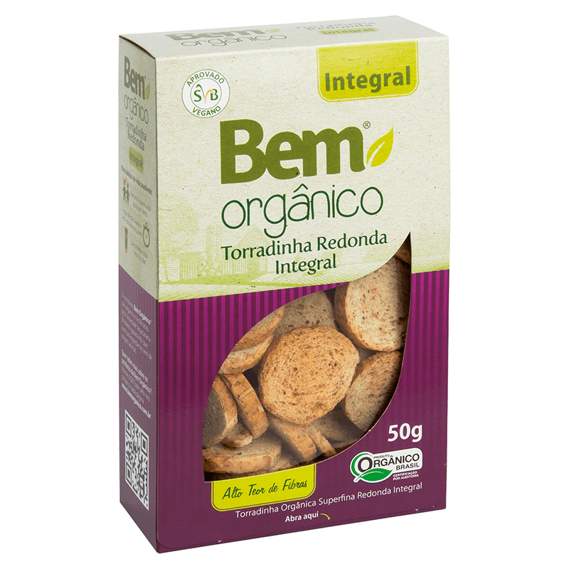 <p>A Torrada Integral Orgânica Redonda, da Bem Orgânico possui alto teor de fibras e são feitas com matéria-prima orgânica, sem utilização de agrotóxicos e outros compostos químicos, além de não ter corantes ou conservantes na sua formulação.<br><br>Benefícios da Torrada Integral Orgânica Redonda, da Bem Orgânico:<br>Apenas 125Kcal por porção<br>Com teor reduzido de sódio<br>Zero gordura trans<br>Origem orgânica<br>Com ingredientes integrais<br>Recomendações de consumo:<br>A Torrada Integral Orgânica Redonda é ideal para canapés, café da manhã ou lanches intermediários, no intervalo das refeições principais (almoço e jantar).</p>