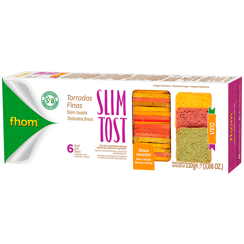 <p>Com apenas 5 kcal por unidade, as torradas <strong>Slim VEG da Fhom</strong>, além de coloridas e animadas, são deliciosas, cada cor representa um vegetal que é utilizado em sua composição espinafre, beterraba e cenoura.</p> Sobre os ingredientes: <p>Contém derivados de trigo e soja. Pode conter aveia, centeio, cevada e triticale.</p> Motivos para escolher o produto: <ul> <li> <p>Sem ovo</p> </li> <li> <p>Sal light</p> </li> <li> <p>Fininhas e crocantes</p> </li> <li> <p>Feita com vegetais</p> </li> <li> <p>Vegano</p> </li> </ul> Sobre a marca: <p>A <strong>Fhom</strong> é uma empresa criada em 1994, que possui como objetivo fornecer produtos de qualidade superior aos clientes, respeitando princípios como inovação tecnológica, apresentação diferenciada e extremo cuidado na fabricação. Atualmente possui produtos com certificado orgânico ECOCERT e SVB, além de todos serem feitos com o mais restrito controle, para garantir a não contaminação com glúten, lactose e outros ingredientes alergênicos.</p>