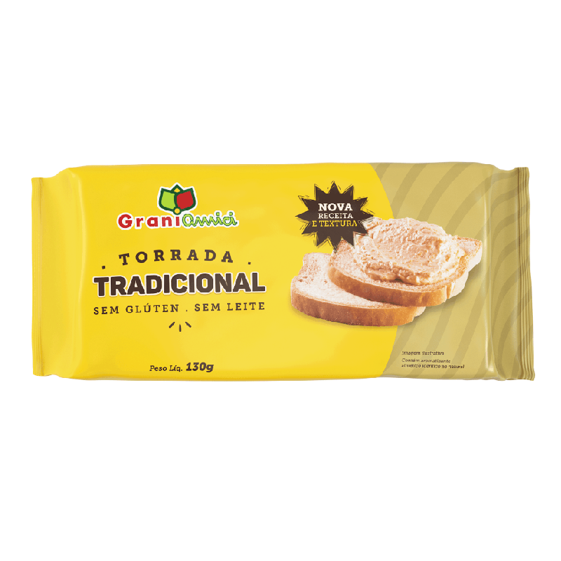 <h2 style="text-align: justify;"><strong>Torrada tradicional</strong> <strong>Grani Amici 130g </strong></h2> <h2 style="text-align: justify;">A <strong>Torrada tradicional Grani Amici</strong>, é produzido com farinhas sem glúten, sem adição de leite e possui um leve sabor amanteigado. São extremamente crocantes e foram desenvolvidas para dar mais leveza aos lanches intermediários e café da manhã.</h2> <h2 style="text-align: justify;"><strong>Sobre os ingredientes:</strong></h2> <h2 style="text-align: justify;"><strong>Alérgicos</strong>: contém ovos. <br /><strong>Pode conter:</strong> derivados de soja, amêndoas e castanha do caju.</h2> <h2 style="text-align: justify;"><strong>Sugestão de consumo:</strong></h2> <h2 style="text-align: justify;">Ideal para consumir em lanches intermediários e café da manhã.</h2> <h2 style="text-align: justify;"><strong>Motivos para escolher o produto:</strong></h2> <h2 style="text-align: justify;">● Produto sem glúten; </h2> <h2 style="text-align: justify;">● Sem lactose;</h2> <h2 style="text-align: justify;">● Sem leite (APLV);</h2> <h2 style="text-align: justify;"> </h2> <h2 style="text-align: justify;"><strong>A Marca</strong></h2> <h2 style="text-align: justify;">Fundada em 2010, a Grani Amici tem o propósito de oferecer bem-estar e inclusão às pessoas com intolerâncias e alergias alimentares, através da fabricação dos melhores panificados livres de glúten, leite e lactose! Os alimentos Grani Amici são elaborados com a segurança que nossos consumidores merecem e precisam. Destinados a todos aqueles que querem viver livres de preocupações na hora de se alimentar!</h2>
