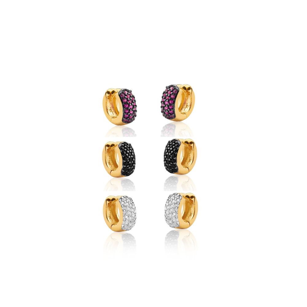 Trio de Brinco de Argolas Pequenas com zirconias brancas, negras e rubi banhado em ouro