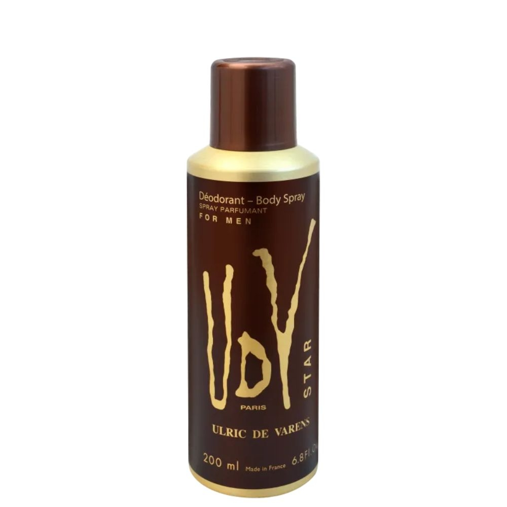 O desodorante masculino UDV Star surge com uma explosão de frescor cintilante da Bergamota e da Mandarina. <br /> <br /> Uma estrela: UDV Star da linha UDV mais emblemática da marca. O ouro aparece nesta nova criação e concede um toque mais rico e luxuoso ao portfólio UDV.<br /> <br /> O desodorante masculino UDV Star surge com uma explosão de frescor cintilante da Bergamota e da Mandarina. A força aromática é instalada nas notas de coração e se desenvolve nas facetas masculinas e atemporais da Lavanda e da Sálvia. A intensidade e o calor do Couro, elemento essencial que dá assinatura ao perfume, juntamente com a força do Patchouli, fazem uma fragrância de contrastes e grande personalidade.