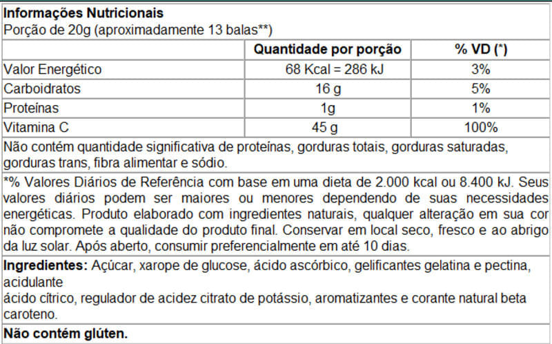 <p>"A Valda C, da Valda, é uma bala de gelatina sabor laranja mentolada, que fornece 45 mg de vitamina C na porção. Uma alternativa saborosa e prática para ajudar a atingir a quantidade desta vitamina junto a uma alimentação equilibrada. </p>_x000D_ <p>Por que escolher esse produto? </p>_x000D_ <p>• Rica em vitamina C </p>_x000D_ <p>• Sem glúten </p>_x000D_ <p>• Textura macia </p>_x000D_ <p>• Livre de corantes artificiais </p>_x000D_ <p>Sobre a marca: </p>_x000D_ <p>A Valda possui mais de 100 anos de história, iniciando com as patilhas contendo substâncias antissépticas. Atualmente, sua fábrica conta com equipamentos modernos necessários ao desenvolvimento e a pesquisa de novos produtos, além de uma equipe de químicos e farmacêuticos, para garantir um controle de qualidade de nível internacional."</p>_x000D_ <p> </p>