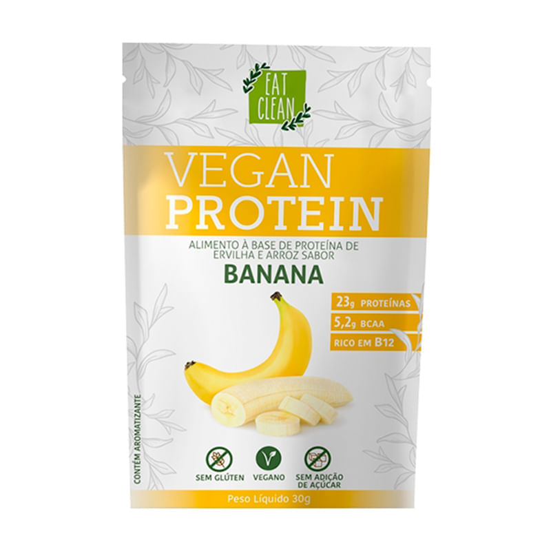 <p>O Sach Vegan Protein Banana, da Eat Clean, 30g, combina a prote’na da ervilha e do arroz, fontes vegetais de alta qualidade, proporcionando uma prote’na vegana com sabor, textura e cremosidade œnica. Fornece 23g de prote’nas na por‹o com adi‹o de vitaminas do complexo B, inclusive a B12, alŽm dos minerais zinco e selnio. Adoada com stevia, o produto n‹o contŽm adi‹o de aœcares.</p>