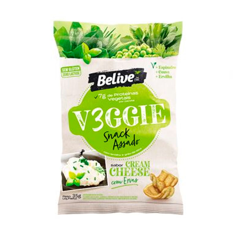 <p>Informações técnicas do produto:<br>O Veggie snack sabor cream cheese com ervas, da Belive, 35g, é um salgadinho assado vegano a base de grãos e leguminosas, com proteína isolada da soja e ervilha, fornecendo 7 g de proteína no pacote.<br><br>Com espinafre, couve, cebola e salsa que trazem mais sabor e nutrientes ao seu snack. Livre de glúten e lactose é uma ótima opção para os lanches.<br><br>Recomendação de consumo:<br>Pode ser consumido a qualquer hora do dia como uma deliciosa opção de lanche na faculdade, trabalho, academia, onde quiser.<br><br>Alergênicos:<br>Contém derivados de soja.<br><br>Motivos para escolher esse produto?<br>Vegano<br>Milho não transgênico<br>Não contém glúten<br>Sem lactose ou leite<br>Com lentilha e grão de bico<br>Baixo teor de gordura<br>Com espinafre, couve e ervilha<br>Proteínas vegetais da soja e ervilha<br>7 g proteína no pacote<br>Informações sobre a marca:<br>A Belive é uma marca que acredita que para ser livre, é preciso ter escolhas saudáveis e saborosas. E dar espaço para a alegria da liberdade de comprar o que você realmente gosta. E comprar o produto sem medo e comer sem culpa. A empresa tem uma linha de produtos inteiramente livre de glúten, sem lactose e sem ovos.</p>