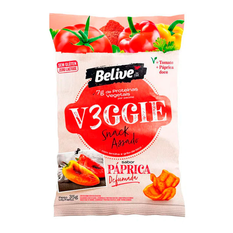 <p>Informações técnicas do produto:<br>O Veggie snack páprica defumada, da Belive, 35g, é um salgadinho assado vegano a base de grãos com proteína isolada da soja e ervilha, fornecendo 7 g de proteína no pacote.<br><br>A páprica doce junto ao tomate e a cebola em pó, intensificam o sabor desse snack. Livre de glúten e lactose é uma ótima opção para os lanches.<br><br>Recomendação de consumo:<br><br>Pode ser consumido a qualquer hora do dia como uma deliciosa opção de lanche na faculdade, trabalho, academia, onde quiser.<br><br>Alergênicos:<br>Contém derivados de soja.<br><br>Motivos para escolher esse produto?<br>Vegano<br>Milho não transgênico<br>Não contém glúten<br>Sem lactose ou leite<br>Com lentilha e grão de bico<br>Baixo teor de gordura<br>Proteínas vegetais da soja e ervilha<br>7 g proteína no pacote<br>Informações sobre a marca:<br>A Belive é uma marca que acredita que para ser livre, é preciso ter escolhas saudáveis e saborosas. E dar espaço para a alegria da liberdade de comprar o que você realmente gosta. E comprar o produto sem medo e comer sem culpa. A empresa tem uma linha de produtos inteiramente livre de glúten, sem lactose e sem ovos.</p>