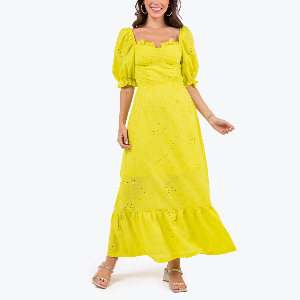 Vestido corpete confeccionada em laise, um tecido com bordados florais; O modelo possui comprimento longo e modelagem superior em corpete, que desenha a silhueta e destaca o busto; O modelo conta com mangas bufantes com elástico, busto com babados aplicados e cintura marcada; O bordado em flores traz feminilidade ao visual; Os vestidos alongados em tecidos de laise são peças femininas e ideais para serem usados em ocasiões que pedem leveza; Aposte com rasteiras gladiadoras metalizadas e bolsa tiracolo colorida, para um visual casual; Muito visto nas passarelas da última temporada, os vestidos com corsete são ultra femininos e trazem um toque romântico ao visual; Aposte!<br><br>.<br><br>Produto: Vestido Corpete Laise Amarelo <br>Categoria: Vestidos<br>Cor: Amarelo <br>Manga: Manga 3/4<br>Gola: Gola Reta<br>Tecido: Laise<br>Composição: 90% Poliester, 10% algodão<br>Peso :200 g<br>Gênero: Feminino<br>Marca: Vértice<br>.<br><br><br><br>Medidas.<br><br>P - Busto até 90 cm l Cintura até 71 cm l Quadril até 99 Cm.<br>M - Busto até 96 cm l Cintura até 77 cm l Quadril até 102 cm.<br>G - Busto até 102 cm l Cintura 83 cm l Quadril 111 cm.<br>GG - Busto 108 cm l Cintura até 89 cm l Quadril até 117 cm.<br>EGG - Busto até 114 cm l Cintura até 95 cm l Quadril até 123 cm.<br><br><br><br><br><br><br><br><br><br><br><br><br><br><br><br><br><br><br><br><br><br><br><br><br><br><br><br><br><br><br><br>