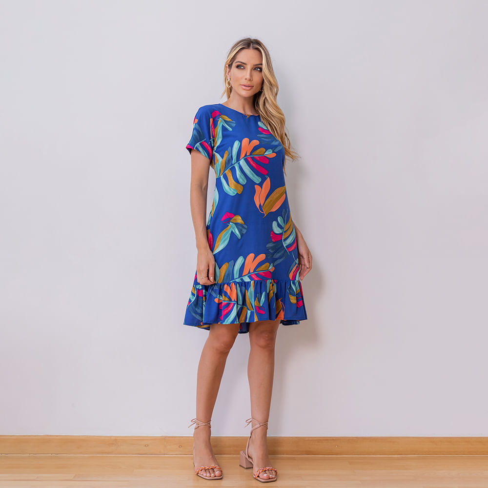 Vestido feminino confeccionado em tecido crepe super soft estampado; Modelo conta com modelagem evasê super feminina e comprimento mini; Possui decote redondo, mangas curtas e babado aplicado na barra; Estampa corrida em aquarela com tons leves e suaves; Possui forro de malha para sua segurança e conforto; Os vestidos de comprimento mini são refrescantes e ideais para combinar com calçados leves e delicados como as rasteiras, sandálias e calçados flats; Se jogue nos detalhes e aposte nas sandálias de tiras coloridas e arremate com uma bolsa baguete laranja! Os vestidos curtos femininos são uma ótima opção para quem adora estar bem vestida e super comfy; Faça como as fashionistas e incorpore muitos acessórios modernos para completar seu visual e contrapor com a delicadeza da estampa e do babado da peça;<br><br><br>.<br><br>Produto: Vestido Crepe Folhagem com Babado Azul<br>Categoria: Vestidos<br>Cor: Azul<br>Estampa em Aquarela<br>Manga: Sem Manga<br>Gola: Gola Redonda<br>Tecido: Super Soft Estampado (Crepe)<br>Composição: 88% Poliester / 12% Elastano <br>Peso: 300g<br>Gênero: Feminino<br>Marca: Vértice<br><br><br>Medidas.<br>P - Busto até 90 cm l Cintura até 71 cm l Quadril até 99 Cm.<br>M - Busto até 96 cm l Cintura até 77 cm l Quadril até 102 cm.<br>G - Busto até 102 cm l Cintura 83 cm l Quadril 111 cm.<br>GG - Busto 108 cm l Cintura até 89 cm l Quadril até 117 cm.<br>EGG - Busto até 114 cm l Cintura até 95 cm l Quadril até 123 cm.<br><br><br><br><br><br><br><br><br><br><br><br><br><br><br><br><br><br><br><br><br>