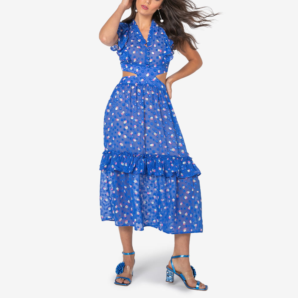 Vestido feminino longo confeccionado em tecido de poliéster e com caimento fluido; Modelo conta com mangas curtas com babados, recortes estratégicos na cintura que afinam a silhueta, estampa corrida colorida e babados aplicados no decote em V; As peças únicas são a melhor opção para usar em um almoço com a família, por serem peças praticas, leves e estilosas; O vestido longo estampado é perfeito para combinar com sandália de salto bloco e arrematar com acessórios alegres e descontraídos; Os vestidos longos femininos com recortes estratégicos são as peças favoritas das mulheres antenadas na moda e adoram sempre levar feminilidade ao visual; Aposte no vestido feminino longo com babados para uma produção ainda mais romântica e charmosa;<br><br>.<br><br>Produto: Vestido Longo Babado Azul<br>Categoria: Vestidos<br>Cor: Azul<br>Manga: Manga Curta<br>Gola: Gola em V<br>Tecido: Poliester / Tecido Fluido<br>Composição : 100% poliester<br>Peso :200 g<br>Gênero: Feminino<br>Marca: Vértice<br>.<br><br><br>Medidas.<br><br>P - Busto até 90 cm l Cintura até 71 cm l Quadril até 99 Cm.<br>M - Busto até 96 cm l Cintura até 77 cm l Quadril até 102 cm.<br>G - Busto até 102 cm l Cintura 83 cm l Quadril 111 cm.<br>GG - Busto 108 cm l Cintura até 89 cm l Quadril até 117 cm.<br>EGG - Busto até 114 cm l Cintura até 95 cm l Quadril até 123 cm.<br><br><br><br><br><br><br><br><br><br><br><br><br><br><br><br>