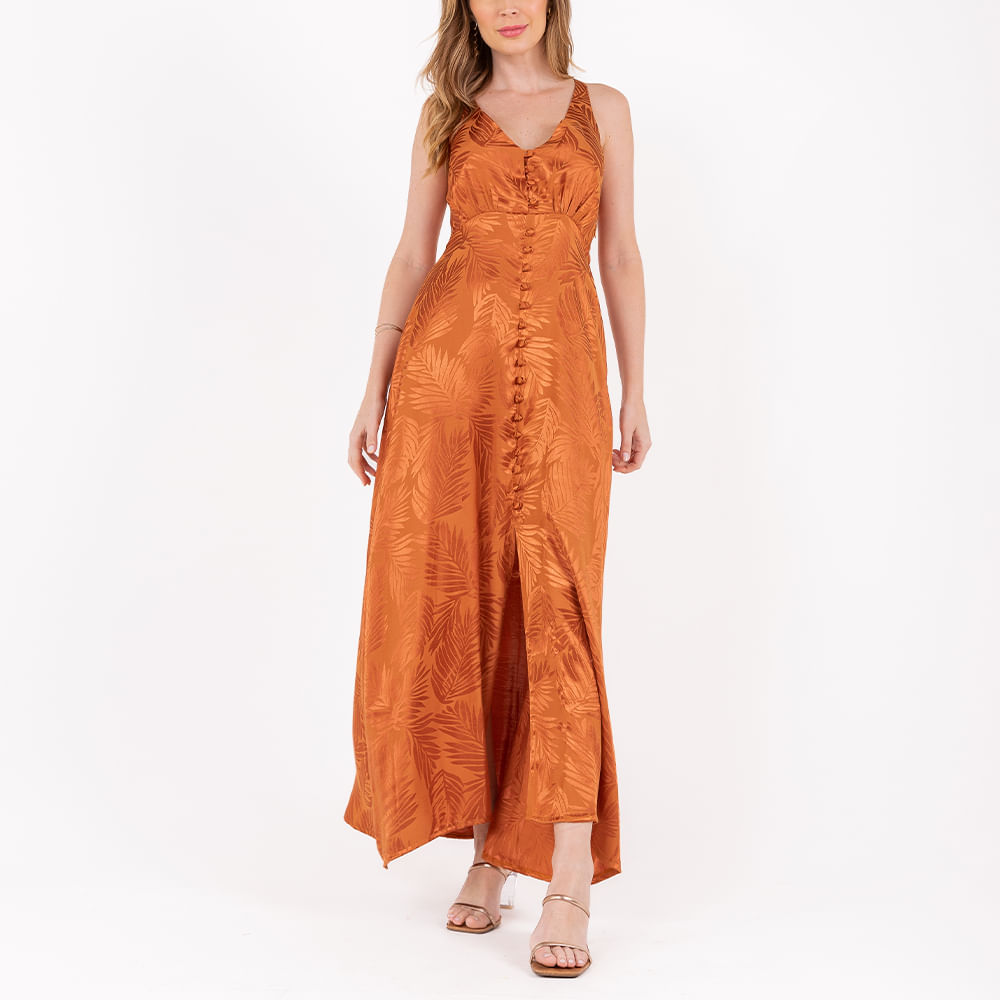 Vestido feminino confeccionando em cetim estampado, um tecido com caimento leve e sofisticado; Modelo conta com decote V amplo, alças médias, cintura levemente marcada e estampa corrida com temática tropical; Detalhe de botões frontais trazendo um charme á peça; O vestido com botões frontais é perfeito para um look diurno em ar livre; Aposte em uma sandália de tons neutros e uma bolsa com detalhes naturais para um visual ainda mais leve e diurno; Os vestidos longos coloridos trazem muita alegria ao look, por isso é a peça queridinha das brasileiras que adoram saber das tendências de moda; Invista!<br><br><br>.<br><br>Produto: Vestido Longo Botões Cobre<br>Código: VES2226COB<br>Categoria: Vestido<br>Cor: Cobre<br>Manga: Sem Manga<br>Gola: Gola em V<br>Tecido: Cetim Estampado<br>Composição: 55,8 % poliester / 44,2% viscose<br>Peso: 300 g<br>Gênero: Feminino<br>Marca: Vértice<br>.<br><br><br><br>Medidas.<br><br><br><br>P - Busto até 90 cm l Cintura até 71 cm l Quadril até 99 Cm.<br>M - Busto até 96 cm l Cintura até 77 cm l Quadril até 102 cm.<br>G - Busto até 102 cm l Cintura 83 cm l Quadril 111 cm.<br>GG - Busto 108 cm l Cintura até 89 cm l Quadril até 117 cm.<br>EGG - Busto até 114 cm l Cintura até 95 cm l Quadril até 123 cm.<br><br><br><br><br><br><br><br><br><br><br><br><br><br><br><br><br> <br><br><br><br><br><br><br><br><br><br><br><br><br><br><br><br><br><br><br><br><br><br><br><br><br><br><br><br><br><br><br><br><br><br>
