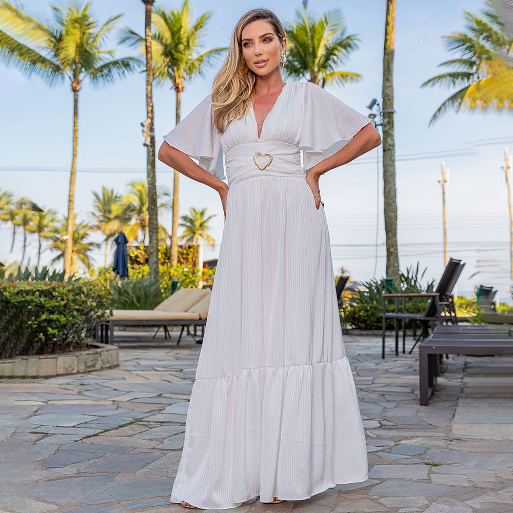 O vestido longo decote V com fivela é uma peça que combina elegância e sofisticação, tornando-se uma escolha versátil para diversos benefícios; Este estilo de vestido é uma tendência que se destaca por sua beleza e atemporalidade, tornando-o um item essencial no guarda-roupa de qualquer mulher que busca um visual refinado e contemporâneo; O decote em V, presente neste vestido, é um elemento que valoriza o colo e acompanha a silhueta, criando uma sensação de altura e elegante; Além disso, o detalhe da fivela adiciona um toque de sofisticação ao vestido criando um ponto focal que atrai olhares e acrescenta um charme extra à peça; O comprimento longo do vestido acrescenta um toque de glamour, fazendo com que ele seja a escolha perfeita para eventos formais, como casamentos, festas de gala ou jantares elegantes; Em relação aos tecidos, os vestidos longos decotes V com fivela estão disponíveis em uma variedade de materiais, desde seda até chiffon, o que permite escolher a opção que melhor se adapta à estação e à ocasião; Para completar o look, é possível combinar este vestido com acessórios que realcem sua beleza, como brincos, colares ou pulseiras; Além disso, um par de saltos altos pode alongar ainda mais a silhueta e acentuar a elegância do vestido; <br>.<br><br>Produto: Vestido Longo Decote V com Fivela Offwhite <br>Categoria: Vestido<br>Cor: Offwhite <br>Manga: Curta<br>Gola: Gola em V<br>Tecido: Annecy Tango <br>Composição: 100% Polister<br>Peso : 300g<br>Gênero: Feminino<br>Marca: Vértice<br><br>Medidas da Modelo<br>Altura: 1,70 cm<br>Busto: 89 cm<br>Cintura: 65 cm<br>Quadril: 94cm<br>A MODELO VESTE O TAMANHO P<br>.<br>Medidas.<br>P - Busto até 90 cm l Cintura até 71 cm l Quadril até 99 Cm.<br>M - Busto até 96 cm l Cintura até 77 cm l Quadril até 102 cm.<br>G - Busto até 102 cm l Cintura 83 cm l Quadril 111 cm.<br>GG - Busto 108 cm l Cintura até 89 cm l Quadril até 117 cm.<br>EGG - Busto até 114 cm l Cintura até 95 cm l Quadril até 123 cm.