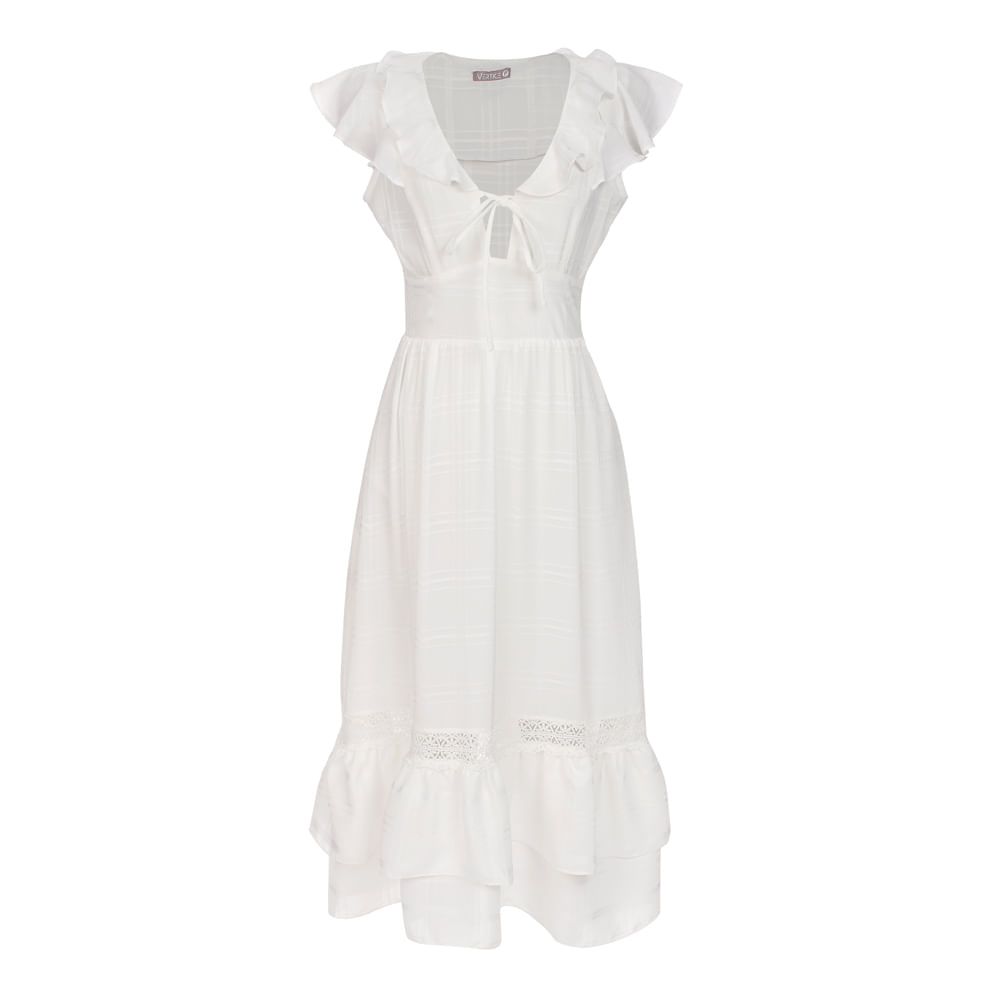 O Vestido Longuete Babado tem gola em V com amarração no decote com tecido leve ótimo para aqueles dias mais quentes. O Vestido Longuete Babado é perfeito para quem gosta de um look mais romântico ou um pouco mais despojado, com rasteirinhas e acessórios certos como colares para valorizar o decote você dá um Up na sua produção e com look perfeito para um happy hour, passeio no parque,shopping eventos não muito formais você vai arrasar. O vestido ombro a ombro foi inspirado na moda cigana no ano de 1970 e hoje é um dos queridinhos entre as fashionistas escolha o seu e arrase nas suas produções. . Produto: Vestido Longuete Babado OffWhite Código: VES2209OFF Categoria: Vestidos Tecido: Poliéster Composição : Crepe Maquineado 100% Poliéster Forro: 100% Poliéster Gola : Em V Cor: OffWhite Peso: 350 g Comprimento : Médio Manga: Curta Gênero: Feminino Marca: Vértice Medidas. P - Busto até 90 cm l Cintura até 71 cm l Quadril até 99 Cm. M - Busto até 96 cm l Cintura até 77 cm l Quadril até 102 cm. G - Busto até 102 cm l Cintura 83 cm l Quadril 111 cm. GG - Busto 108 cm l Cintura até 89 cm l Quadril até 117 cm.