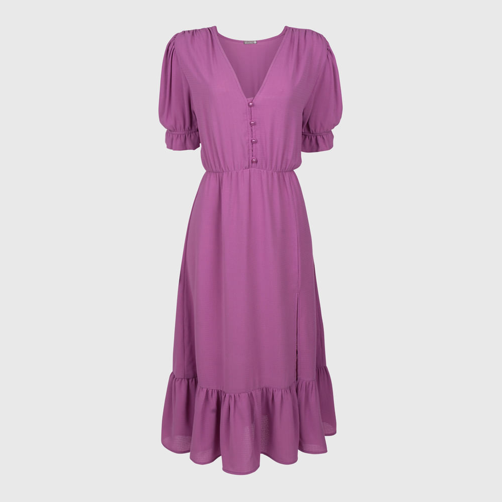 O vestido é tendência e caiu no gosto das fashion girl?s e vai continuar nas próximas temporadas. <br>O vestido com manga curta bufante e fenda lateral é uma proposta cobiçada entre as mulheres o vestido possui comprimento mídi traz detalhes de botões, é uma mistura entre o wrap dress e evasê <br>Com um mood bem french girl, use com rasteiras para compromissos diurnos e com<br>salto e uma bolsa carteira para eventos mais formais. Aposte!<br><br>.<br> <br>Produto: Vestido manga curta rodado<br>Código: Ves2035LAV<br>Forro: Sim <br>Categoria: Vestidos<br>Tecido: Viscose <br>Composição ;100 % Viscose <br>Gola : Gola V <br>Cor: Lavanda<br>Comprimento :Longo<br>Manga: Média<br>Gênero: Feminino<br>Marca: Vértice Medidas. P - Busto até 90 cm l Cintura até 71 cm l Quadril até 99 Cm. M - Busto até 96 cm l Cintura até 77 cm l Quadril até 102 cm. G - Busto até 102 cm l Cintura 83 cm l Quadril 111 cm. GG - Busto 108 cm l Cintura até 89 cm l Quadril até 117 cm. EGG - Busto até 114 cm l Cintura até 95 cm l Quadril até 123 cm.