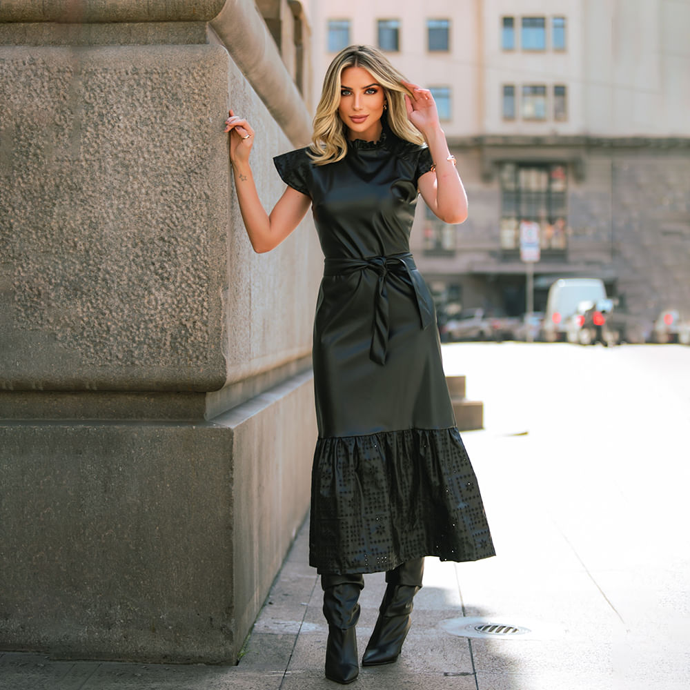 O vestido midi de couro é confeccionado no couro liso juntamente com o couro de laise nas mangas e no babado do vestido, possui gola de babadinho, cinto faixa que permite diversas amarrações e ziper traseiro; O vestido midi de couro laise é uma peça única e elegante que pode ser usada para criar uma variedade de looks; Combine com botas de cano alto; Para um look mais sofisticado e ousado, isso adicionará altura e elegância ao seu visual; Use com tênis; Para um look mais casual e descontraído, você pode combinar o vestido midi de couro laise com tênis; Escolha um par de tênis brancos ou pretos para criar um contraste interessante; Acessórios; Para complementar o seu look, adicione acessórios como brincos ou um colar de ouro para adicionar um toque de glamour; Adicione uma bolsa de ombro pequena para guardar seus pertences essenciais; Uma tendência de moda atual para o vestido midi de couro laise é o uso de cores contrastantes para criar um visual mais impactante; <br><br><br>.<br><br><br>Produto: Vestido Midi Couro Preto<br>Categoria: Vestidos<br>Cor: Preto<br>Manga: Curta<br>Gola: Gola Redonda <br>Tecido: Couro Ecologico <br>Composição: 100% Poliester<br>Peso : 300g<br>Gênero: Feminino<br>Marca: Vértice<br>.<br><br><br><br>Medidas.<br>P - Busto até 90 cm l Cintura até 71 cm l Quadril até 99 Cm.<br>M - Busto até 96 cm l Cintura até 77 cm l Quadril até 102 cm.<br>G - Busto até 102 cm l Cintura 83 cm l Quadril 111 cm.<br>GG - Busto 108 cm l Cintura até 89 cm l Quadril até 117 cm.<br>EGG - Busto até 114 cm l Cintura até 95 cm l Quadril até 123 cm.<br><br><br><br><br><br><br><br><br><br><br><br>