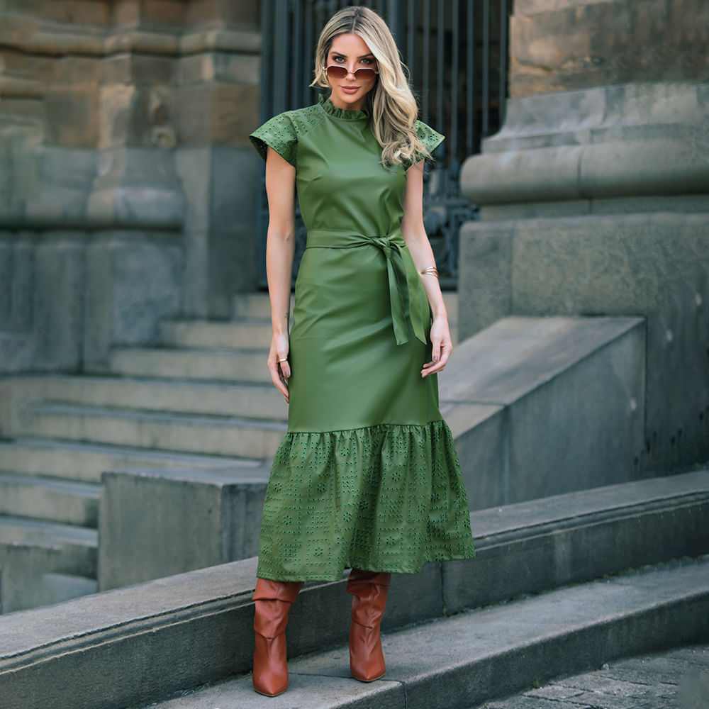 O vestido midi de couro é confeccionado no couro liso juntamente com o couro de laise nas mangas e no babado do vestido, possui gola de babadinho, cinto faixa que permite diversas amarrações e ziper traseiro; O vestido midi de couro laise é uma peça única e elegante que pode ser usada para criar uma variedade de looks; Combine com botas de cano alto; Para um look mais sofisticado e ousado, isso adicionará altura e elegância ao seu visual; Use com tênis; Para um look mais casual e descontraído, você pode combinar o vestido midi de couro laise com tênis; Escolha um par de tênis brancos ou pretos para criar um contraste interessante; Acessórios; Para complementar o seu look, adicione acessórios como brincos ou um colar de ouro para adicionar um toque de glamour; Adicione uma bolsa de ombro pequena para guardar seus pertences essenciais; Uma tendência de moda atual para o vestido midi de couro laise é o uso de cores contrastantes para criar um visual mais impactante; <br><br><br>.<br><br><br>Produto: Vestido Midi Couro Verde<br>Categoria: Vestidos<br>Cor: Verde<br>Manga: Curta<br>Gola: Gola Redonda <br>Tecido: Couro Ecologico <br>Composição: 100% Poliester<br>Peso : 300g<br>Gênero: Feminino<br>Marca: Vértice<br>.<br><br><br>Medidas.<br>P - Busto até 90 cm l Cintura até 71 cm l Quadril até 99 Cm.<br>M - Busto até 96 cm l Cintura até 77 cm l Quadril até 102 cm.<br>G - Busto até 102 cm l Cintura 83 cm l Quadril 111 cm.<br>GG - Busto 108 cm l Cintura até 89 cm l Quadril até 117 cm.<br>EGG - Busto até 114 cm l Cintura até 95 cm l Quadril até 123 cm.<br><br><br><br><br><br><br><br><br><br><br><br>