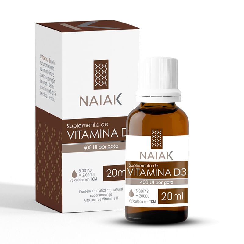 <p>A <strong>Vitamina D3 400UI em gotas Naiak 20ml</strong> é um suplemento que contribui com o fortalecimento do sistema imune, auxiliando na redução de marcadores inflamatórios. Estudos comprovam sua alta capacidade de promover o aumento da absorção de cálcio e fósforo, importantes para a mineralização dos ossos.* É formulada em concentração de 400UI e veiculada em TCM, o que garante uma melhor absorção.</p> <p>A Vitamina D3 é uma vitamina lipossolúvel que possui 2 principais apresentações: D2-Egocalciferol e D3-Colecalciferol. As duas podem ser obtidas através da alimentação, no entanto somente a vitamina D3 é sintetizada a partir da exposição solar.</p> <p>Com a urbanização e a diminuição da exposição ao sol, além dos maus hábitos alimentares e a baixa qualidade dos alimentos, a suplementação com vitamina D, tem se mostrado uma forma segura de manutenção dos níveis ideais de vitamina D3 no sangue.</p> Sobre os ingredientes: <p>Colecalciferol (Vitamina D3), veículo triglicerídeos de cadeia média de origem vegetal, antioxidante acetato de alfa tocoferol, aromatizante natural de morango. Não contém Glúten.</p> Motivos para escolher o produto: <ul> <li> <p>Colecalciferol (vitamina d3) fornece 400ui por gota</p> </li> <li> <p>Auxilia no fortalecimento do sistema imune*</p> </li> <li> <p>Auxilia no fortalecimento ósseo*</p> </li> <li> <p>Com aroma natural de morango</p> </li> </ul> Sobre a marca: <p>A <strong>Naiak</strong> é uma empresa farmacêutica, de origem brasileira, que oferece uma linha completa de produtos nutracêuticos e alimentos funcionais voltados para a beleza e o bem-estar. Buscam cuidar da saúde de dentro para fora. Extraem seus ativos da natureza que em conjunto com a sua alta tecnologia oferecem produtos os quais contribuem para a vitalidade, qualidade de vida e autoestima.</p>