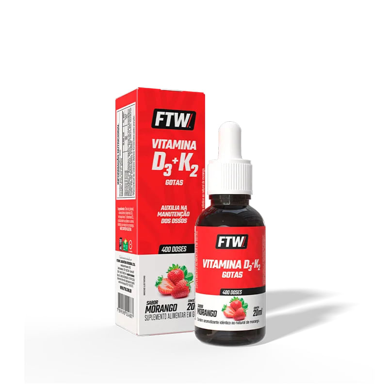 <p><span>A </span><b>Vitamina D3 + K2 gotas FTW</b><span> é um suplemento alimentar em versão líquida, ideal para quem busca praticidade no consumo diário. Cada frasco contém 20 ml com agradável sabor de morango, facilitando a ingestão e proporcionando um alto rendimento. </span></p> <h2><b>Sobre os ingredientes:</b></h2> <p><b>Vitamina D: </b><span>a vitamina D auxilia na formação de ossos e dentes.</span></p> <p><b>Vitamina K: </b><span>a vitamina K auxilia na manutenção dos ossos.</span></p> <h2><b>Sugestão de consumo: </b></h2> <p><span>Seguir recomendação de consumo descrita na embalagem ou conforme orientação do nutricionista ou médico.</span></p> <h2><b>Motivos para escolher o produto: </b></h2> <ul> <li aria-level="1"><span>Rende até 400 doses;</span></li> <li aria-level="1"><span>Vitaminas na forma ativa proporcionando melhor absorção;</span></li> <li aria-level="1"><span>Praticidade para o consumo;</span></li> <li aria-level="1"><span>Sem glúten.</span></li> </ul> <h2><b>A marca:</b></h2> <p><span>A </span><b>FTW</b><span> nasceu do espírito </span><i><span>For The Win</span></i><span>, com a missão de oferecer suplementos de alta qualidade para quem leva o esporte a sério. Mais do que atender às demandas do desempenho físico, a marca inspira atletas de todos os níveis a superarem seus próprios limites, com produtos desenvolvidos para potencializar resultados. Com uma linha completa e rigorosamente testada, a FTW está presente na rotina de quem busca evolução constante. Cada fórmula carrega o compromisso com a performance, a saúde e a superação.</span></p>