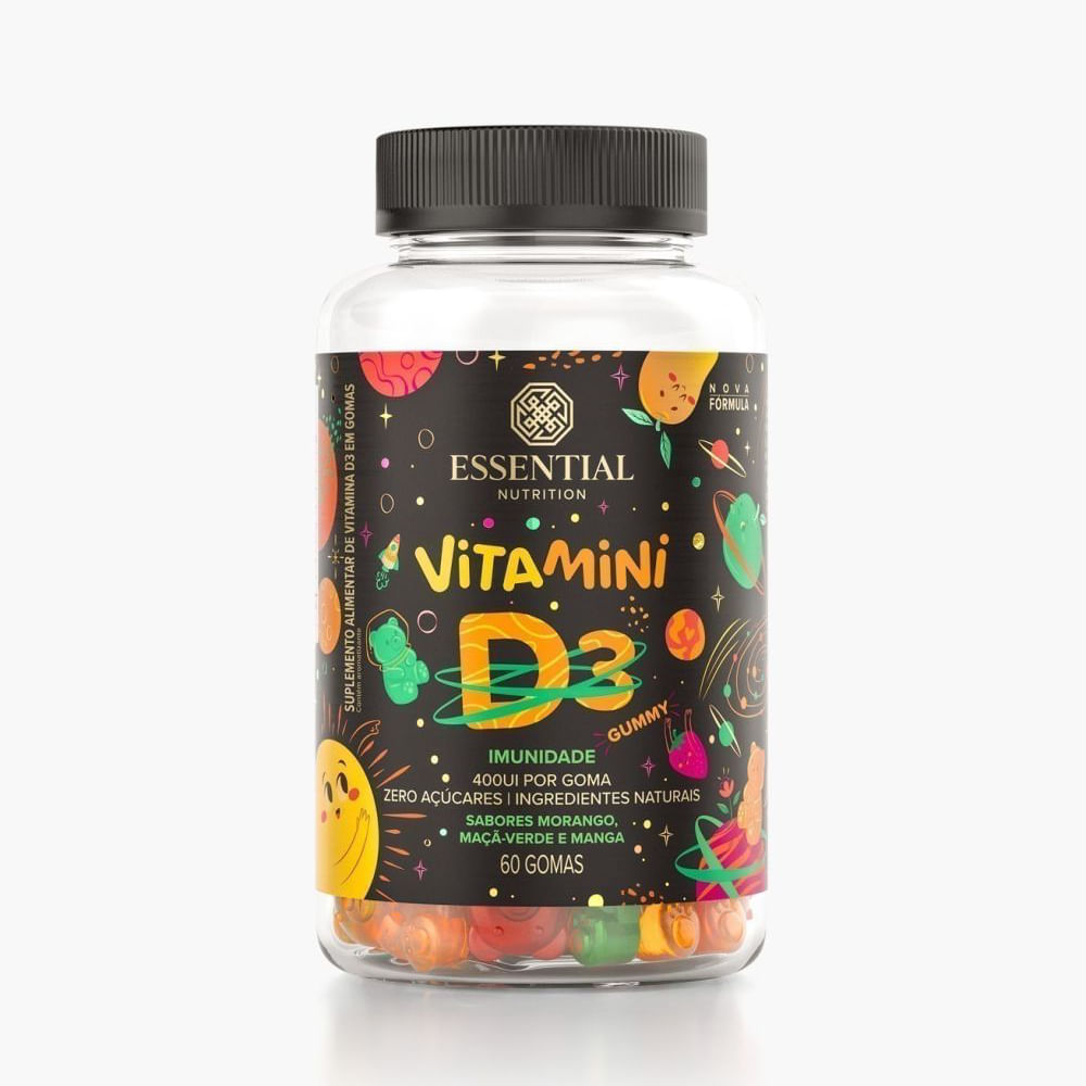 <p dir="ltr">A <strong>Vitamini D3 Gummy Essential Nutrition</strong> são gominhas saborosas e práticas, pensadas especialmente para crianças, que trazem 400 UI de vitamina D por unidade. Sem açúcar, glúten, lactose, conservantes, corantes ou aromas artificiais, tornam a suplementação divertida e fácil de incluir na rotina.</p> <h2 dir="ltr">Sobre os ingredientes</h2> <ul> <li dir="ltr" aria-level="1"> <p dir="ltr" role="presentation"><strong>Vitamina D3:</strong> importante nutriente que contribui para a absorção de cálcio e fósforo, em formato divertido e mastigável.</p> </li> </ul> <h2 dir="ltr">Sugestão de consumo:</h2> <p dir="ltr">Consumir uma goma ao dia, ou conforme orientação do profissional da saúde.</p> <h2 dir="ltr">Motivos para escolher o produto:</h2> <ul> <li dir="ltr" aria-level="1"> <p dir="ltr" role="presentation">400 UI de vitamina D3 por gominha;</p> </li> <li dir="ltr" aria-level="1"> <p dir="ltr" role="presentation">Gominhas sem açúcar, glúten, lactose, corantes ou conservantes;</p> </li> <li dir="ltr" aria-level="1"> <p dir="ltr" role="presentation">Sabores naturais de morango, maçã-verde e manga;</p> </li> <li dir="ltr" aria-level="1"> <p dir="ltr" role="presentation">Formato mastigável e divertido para crianças;</p> </li> <li dir="ltr" aria-level="1"> <p dir="ltr" role="presentation">Prático para incluir na rotina diária.</p> </li> </ul> <h2 dir="ltr">A Marca</h2> <p dir="ltr">A <strong>Essential Nutrition</strong> é uma marca especializada em nutrição funcional, produzindo produtos de extrema qualidade, utilizando as melhores matérias-primas e em suas concentrações ideias, excluindo o uso de ingredientes geneticamente modificados, glúten, lactose, corantes, conservantes e adoçantes artificiais.</p>