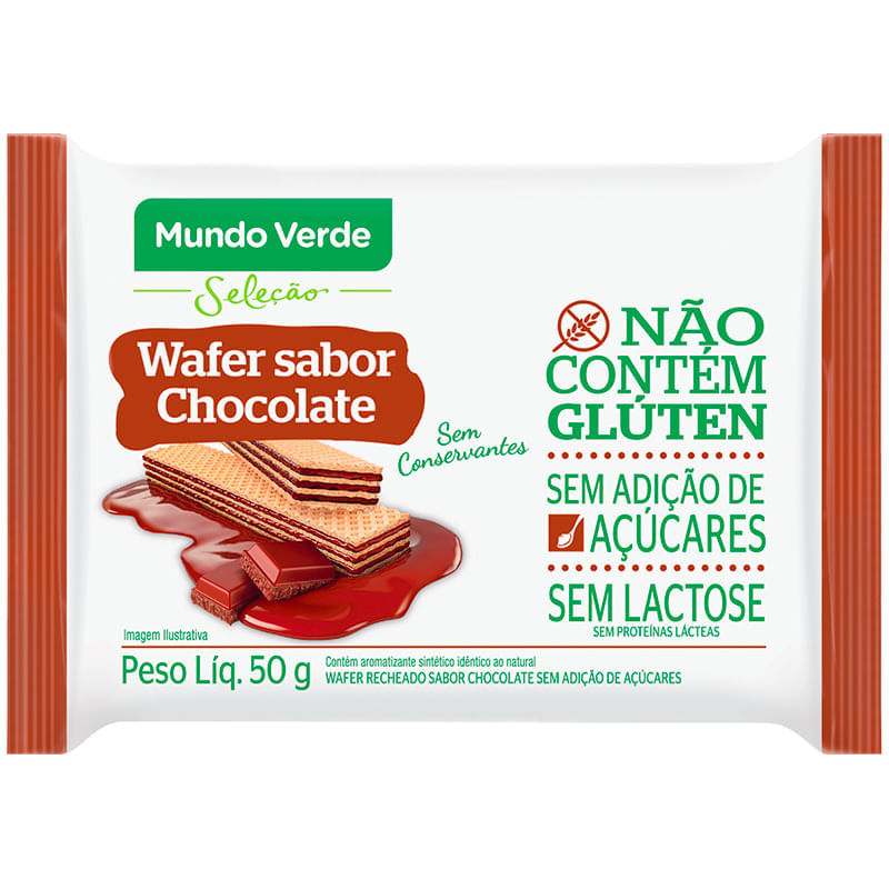 O Wafer sabor chocolate, da Mundo verde seleção, é uma opção de snack sem adição de açúcares. Uma alternativa para celíacos, diabéticos e pessoas com restrições ao leite.<br> <br> Recomendação de consumo:<br> <br> Ideal para os lanches entre as refeições, para levar e se deliciar durante o dia.<br> <br> Por que escolher esse produto?<br> Sem conservantes<br> <br> Sem açúcar<br> Sem glúten<br> Sem gorduras trans<br> Vegetariano<br> Sem lactose<br> Sobre a marca:<br> <br> A Mundo verde seleção é desenvolvida pensando na praticidade e nas escolhas saudáveis do dia a dia das pessoas. A Mundo Verde Seleção traz uma gama de produtos desenvolvidos por quem entende de alimentação saudável, nutrientes, sabores, e do prazer de comer.