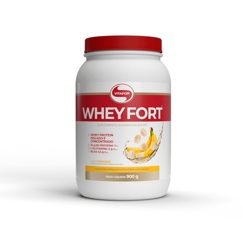<p>O <strong>Whey Fort Banana Vitafor 900g</strong>, é a proteína do soro do leite concentrada e isolada com alto teor de aminoácidos essenciais e BCAA. Fornece 24g de proteínas na porção, com baixo teor de carboidratos, gorduras e de sódio.</p> <p>Feito com polpa de banana proporcionando um sabor delicioso, ainda é isento de glúten, açúcar e conservantes artificiais.</p> Sobre os ingredientes: <p><strong>Whey Fort®:</strong> whey concentrado e isolado extraídos com tecnologia inovadora que permite excelente digestibilidade e máxima absorção de nutrientes. O whey protein é naturalmente fonte de BCAA, L-glutamina, L-prolina e L-arginina, além de conter peptídeos de proteínas como glicomacropeptídeos (GMPs), alfa-lactoalbumina e lactoferrina.</p> Sugestão de Consumo: <p>Misture 31g (uma colher medida) em aproximadamente 300 ml de água ou suco da sua preferência. Beba antes das refeições ou no pré e pós treino ou de acordo com as recomendações de um profissional de saúde.</p> Motivos para escolher o produto: <ul> <li> <p>24 g de proteínas por porção</p> </li> <li> <p>5,5g de BCAA e 4g de glutamina na porção</p> </li> <li> <p>Sem conservantes artificiais</p> </li> <li> <p>Sem glúten</p> </li> <li> <p>Sem açúcar</p> </li> <li> <p>Fonte de peptídeos de proteína do soro do leite</p> </li> <li> <p>Fácil digestão</p> </li> </ul> Sobre a marca: <p>A <strong>Vitafor</strong> é uma marca nacional que está no mercado há mais de 10 anos. Tem como objetivo fabricar e desenvolver suplementos alimentares com padrão de alta qualidade e eficácia. Através de seus produtos, a <strong>Vitafor </strong>oferece confiança e eficácia nos produtos para complementar as necessidades nutricionais daqueles que se preocupam com a saúde, desempenho e bem-estar.</p>
