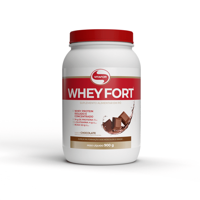 <p>O <strong>Whey Fort Chocolate Vitafor 900g</strong>, é a proteína do soro do leite concentrada e isolada com alto teor de aminoácidos essenciais e BCAA. Fornece 24g de proteínas na porção, com baixo teor de carboidratos, gorduras e de sódio. É isento de glúten, açúcar e conservantes artificiais.</p> Sobre os ingredientes: <p><strong>Whey Fort®:</strong> whey concentrado e isolado extraídos com tecnologia inovadora que permite excelente digestibilidade e máxima absorção de nutrientes. O whey protein é naturalmente fonte de BCAA, L-glutamina, L-prolina e L-arginina, além de conter peptídeos de proteínas como glicomacropeptídeos (GMPs), alfa-lactoalbumina e lactoferrina.</p> Sugestão de Consumo: <p>Misture 31g (uma colher medida) em aproximadamente 300 ml de água ou suco da sua preferência. Beba antes das refeições ou no pré e pós treino ou de acordo com as recomendações de um profissional de saúde.</p> Motivos para escolher o produto: <ul> <li> <p>24 g de proteínas por porção</p> </li> <li> <p>5,5g de BCAA e 4g de glutamina na porção</p> </li> <li> <p>Sem conservantes artificiais</p> </li> <li> <p>Sem glúten</p> </li> <li> <p>Sem açúcar</p> </li> <li> <p>Fonte de peptídeos de proteína do soro do leite</p> </li> <li> <p>Fácil digestão</p> </li> </ul> Sobre a marca: <p>A <strong>Vitafor</strong> é uma marca nacional que está no mercado há mais de 10 anos. Tem como objetivo fabricar e desenvolver suplementos alimentares com padrão de alta qualidade e eficácia. Através de seus produtos, a <strong>Vitafor </strong>oferece confiança e eficácia nos produtos para complementar as necessidades nutricionais daqueles que se preocupam com a saúde, desempenho e bem-estar.</p>