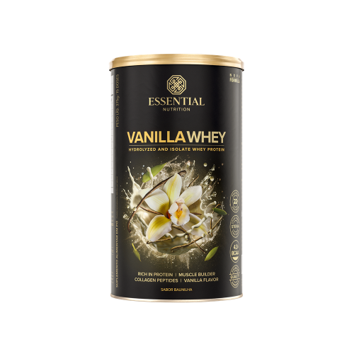 Whey Hidrolisado Essential Nutrition Vanilla 375gVanilla Whey é uma proteína com notas de baunilha e muito versátil. Pura, misturada com frutas ou água de coco, fica uma delícia. Sua fórmula é uma combinação de Whey Protein Hidrolisado e Isolado, aroma de baunilha, além de colágeno hidrolisado em peptídeos que agregam valor à fórmula e complementam a ação do produto.Cada dose de Vanilla Whey fornece 44% das necessidades diárias de proteína recomendadas para um adulto. Essas proteínas são obtidas através do CFM (Cross-Flow Microfiltration), um processo de extração limpo e purificado, que não utiliza produtos químicos para isolar a proteína de componentes indesejáveis, como caseína, gordura, carboidratos e lactose.Quem pratica esporte e toma whey frequentemente precisa de um sabor que seja prazeroso e tenha flexibilidade de uso.Vanilla Whey é uma ótima opção para o café da manhã e lanche. Pode ser facilmente combinado com frutas, não possui açúcar e é adoçado apenas com estévia.Ideal para quem busca uma proteína com ingredientes que respeitam os princípios da nutrição, bem como todo o potencial humano.CONTÉM:Whey Protein Hidrolisado e Isolado (Thermax 690® e Provon 292®)22g de proteína por porçãoColágeno hidrolisado em peptídeos Peptan®BCAA naturalmente em sua composiçãoAdoçado com estéviaCompre agora o Whey Hidrolisado Essential Nutrition Vanilla 375g e garanta uma entrega rápida e segura!