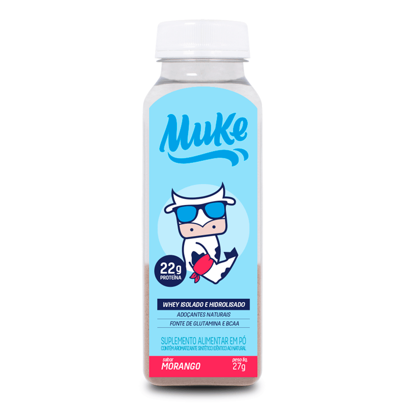 <p>A Garrafinha de Proteína Muke sabor Morango, da + Mu, 27g, é um suplemento alimentar de proteína, composto por whey Protein isolado e hidrolisado. O objetivo da marca foi transformar o tradicional pote em uma versão prática, para que possa ser consumido em qualquer lugar. O suplemento já vem dosado na quantidade certa, fornecendo 22g de proteína por garrafinha. Basta acrescentar água e beber.</p>