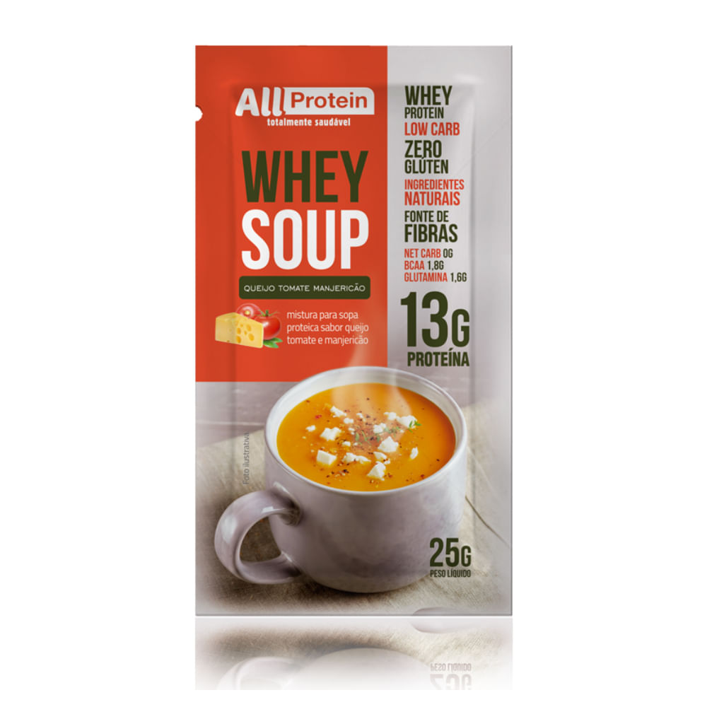<p dir="ltr">A <strong>Whey Soup Sabor Queijo, Tomate e Manjericão da All Protein</strong> combina sabores marcantes com a praticidade de preparo rápido. Nesta mistura para sopa contém whey protein e outros ingredientes selecionados. Ideal para levar a qualquer lugar e fazer uma refeição prática e proteica.</p>_x000D_ <h2 dir="ltr">Sugestão de consumo:</h2>_x000D_ <p dir="ltr">Dilua duas colheres de sopa (25g) em água aquecida. </p>_x000D_ <h2 dir="ltr">Motivos para escolher o produto:</h2>_x000D_ <ul>_x000D_ <li dir="ltr" aria-level="1">_x000D_ <p dir="ltr" role="presentation">Isento de glúten;</p>_x000D_ </li>_x000D_ <li dir="ltr" aria-level="1">_x000D_ <p dir="ltr" role="presentation">Preparo prático;</p>_x000D_ </li>_x000D_ <li dir="ltr" aria-level="1">_x000D_ <p dir="ltr" role="presentation">13g de proteína por porção;</p>_x000D_ </li>_x000D_ <li dir="ltr" aria-level="1">_x000D_ <p dir="ltr" role="presentation">Elaborado com whey protein;</p>_x000D_ </li>_x000D_ <li dir="ltr" aria-level="1">_x000D_ <p dir="ltr" role="presentation">Low carb.</p>_x000D_ </li>_x000D_ </ul>_x000D_ <h2 dir="ltr">A Marca</h2>_x000D_ <p dir="ltr">Fundada em 2014 em Porto Alegre (RS), a <strong>All Protein</strong> nasceu com o propósito de oferecer suplementos e alimentos que unem qualidade, praticidade e sabor. A marca se diferencia pelo uso de ingredientes selecionados, fórmulas que valorizam a inovação nutricional e opções que atendem a diferentes estilos de vida. Com um portfólio versátil e em constante evolução, a All Protein se consolida como referência em produtos que combinam funcionalidade e experiência de sabor.</p>
