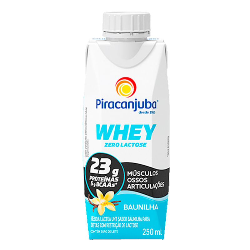 <p>Informações sobre o produto:<br><br>A Bebida Láctea Whey Baunilha, da Piracanjuba, é uma bebida láctea disponível em embalagens de 250ml, é zero lactose, zero glúten, sem adição de açúcar e baixo teor de gorduras.<br><br>Fornece 23g de proteínas e 500mg de cálcio, 5g de BCAA provenientes do whey protein além da adição de colágeno.<br><br>Recomendações de consumo:<br><br>Após aberto, consumir imediatamente. Beba gelado como pré e pós treino ou acompanhando lanches intermediários.<br><br>Por que escolher esse produto?<br>Fonte de proteínas<br>Fonte de cálcio<br>Feito com whey concentrado<br>Fonte de colágeno<br>Sem glúten<br>Sem adição de açúcares<br>Baixo teor de gorduras<br>Prático<br>Sobre a marca:<br><br>Para a Piracanjuba, qualidade e inovação são os melhores ingredientes para uma trajetória de sucesso. Foi pela iniciativa de uma família goiana que nasceu, em 1955, a primeira Unidade, na cidade de Piracanjuba (GO). Em 2020, ao completar 65 anos de mercado, a empresa celebra a posição de 9ª marca mais escolhida nos lares de todo o país.<br><br><br><br><br></p>